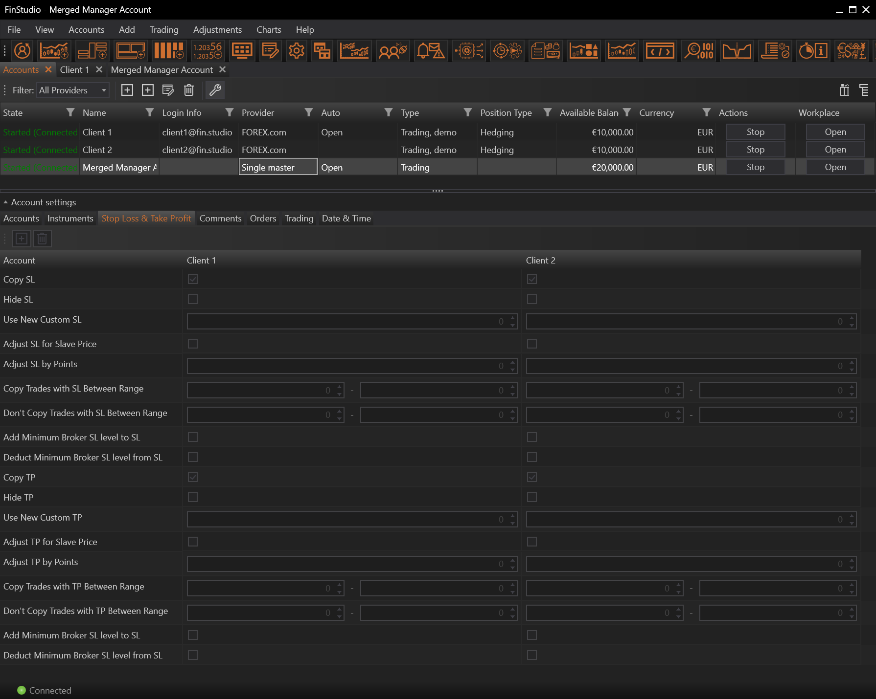 If checked it will copy Stop Loss from merged account to client. If not checked, Stop Loss is ignored and not sent to the client's account.