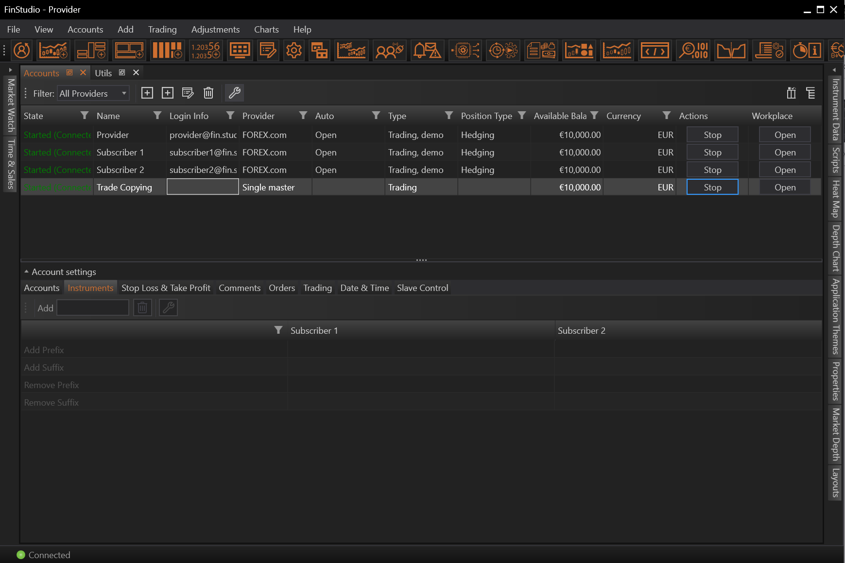 We first add the provider instrument and then we keep adding instruments for subscribers, so EURUSD in the provider will correspond to all added instruments. Search will only look for the instruments provided by a specific provider, the one that account belongs to.