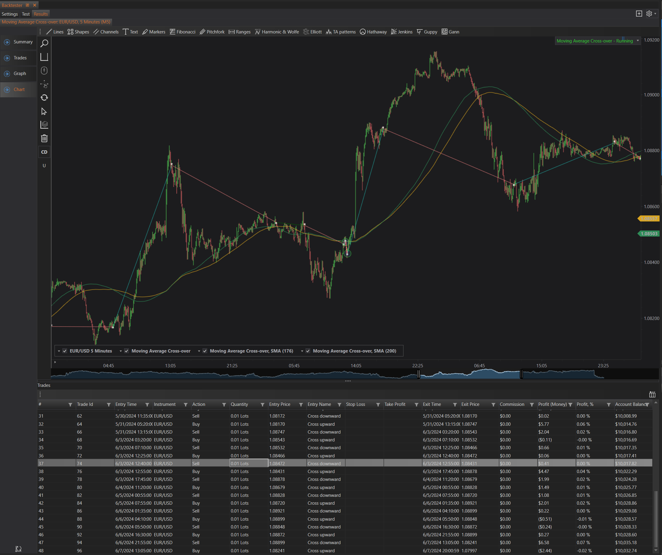 - Indicator Plots: Display of various indicators used in the strategy. This can include moving averages, trend lines, and other technical analysis tools configured during the strategy setup.