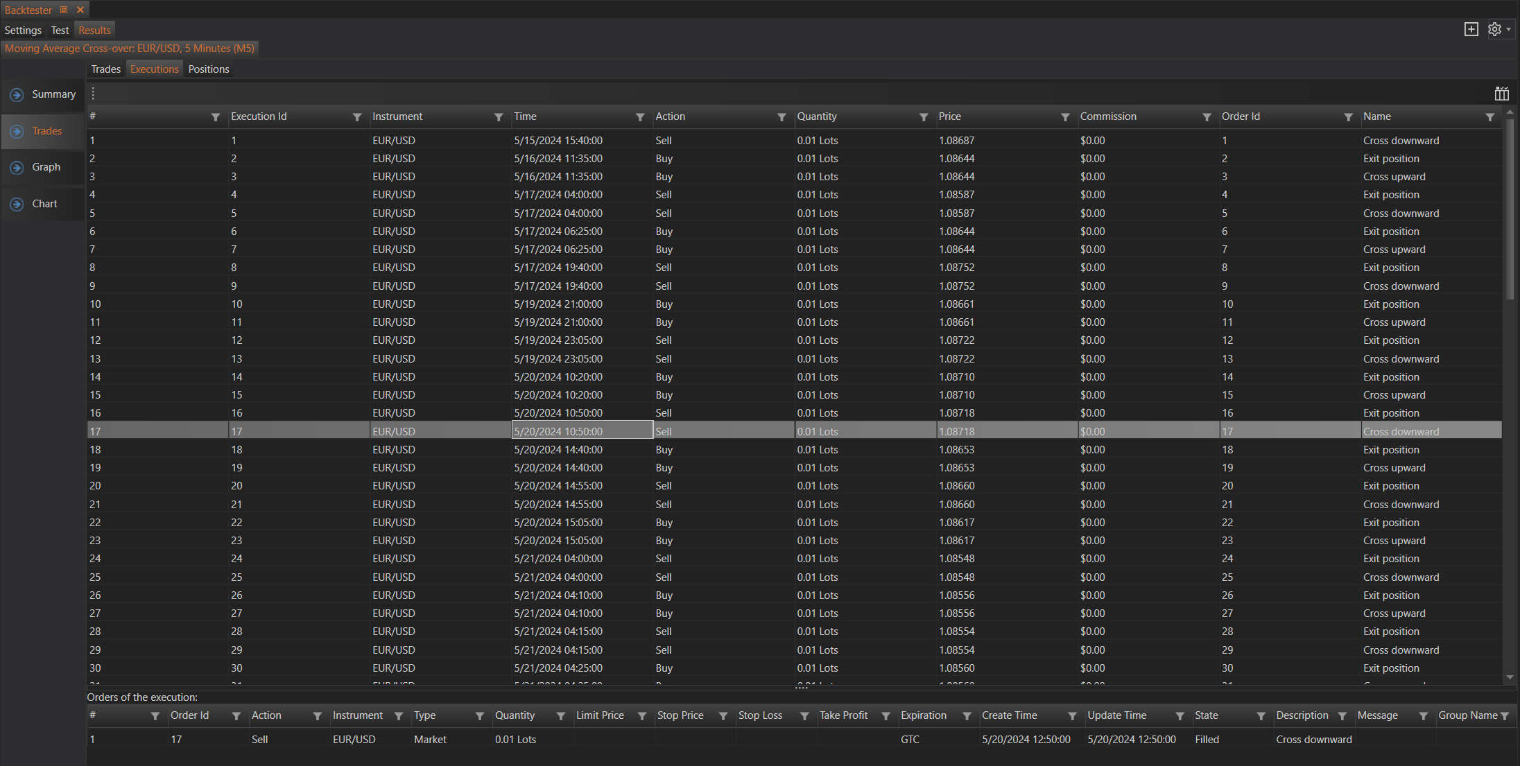 This subsection details each order execution, providing a more granular view of the trading process. Each row represents an order execution, with the following columns providing specific details: