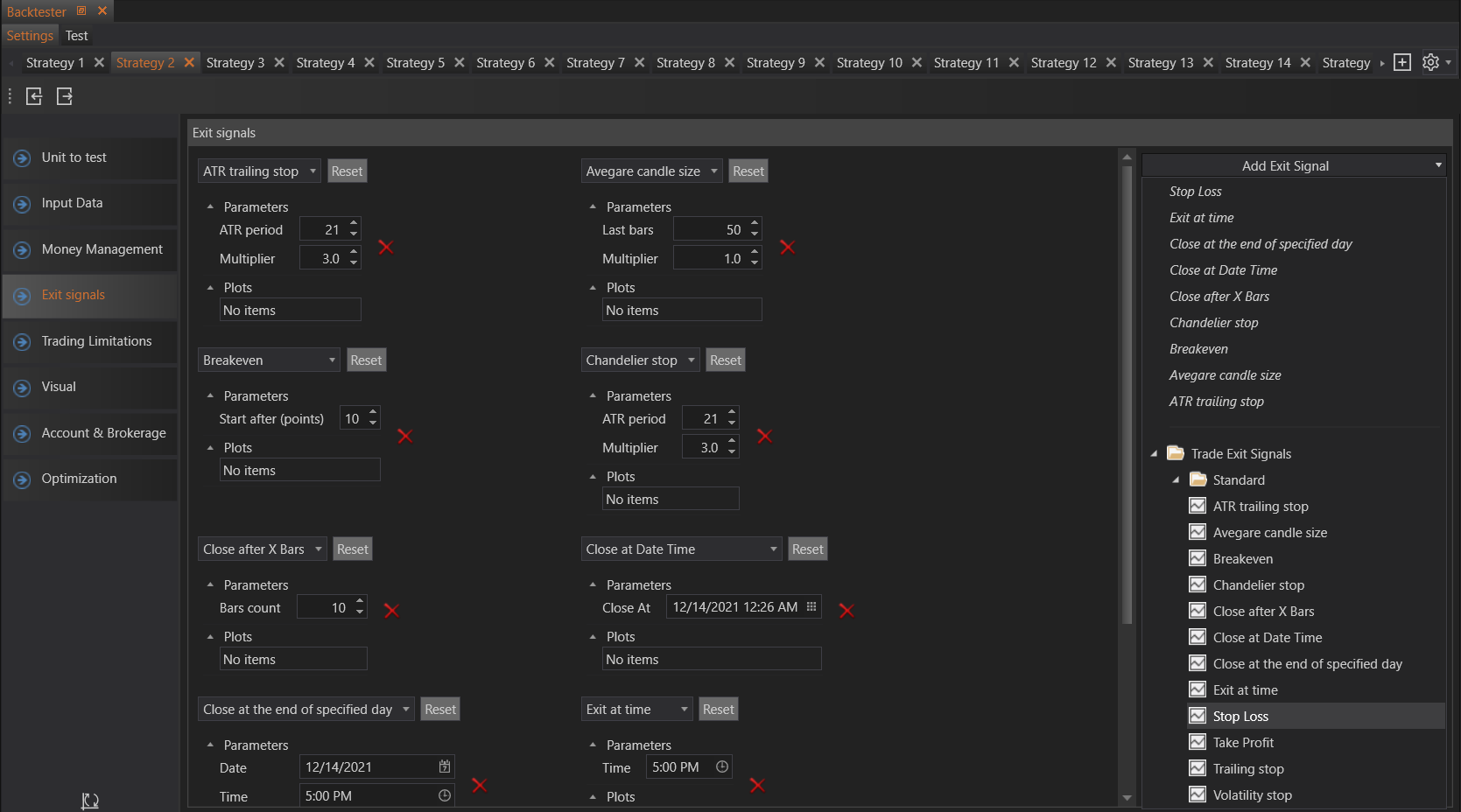 To add exit signal just select it from the list and add it. Signals are then displayed in the Exit Signals section where they can also be configured. Â