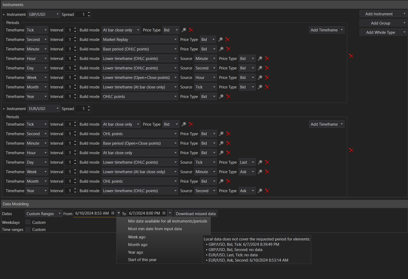 - Max Date Available for All Instruments/Periods: The latest date for which data is available across all selected instruments and periods.