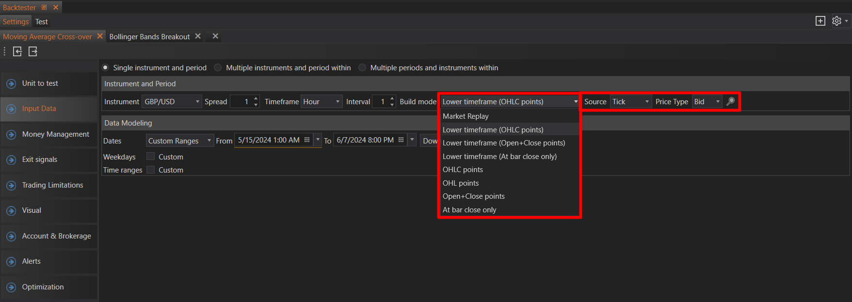 By carefully selecting the appropriate build mode and timeframes, users can ensure their backtests are both precise and relevant to their specific trading strategies. This approach allows for detailed and accurate simulations, enhancing the reliability of the backtest results.