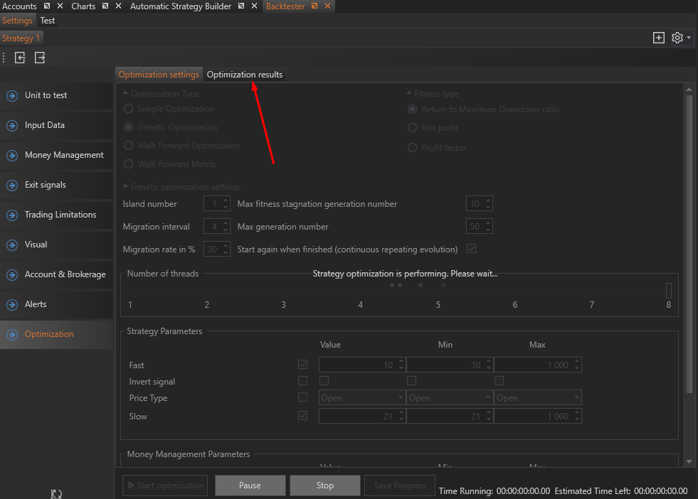 Genetic Optimization: This method uses genetic algorithms to find the best combination of parameters. It works much faster than Brute-Force optimization by mimicking natural selection processes.