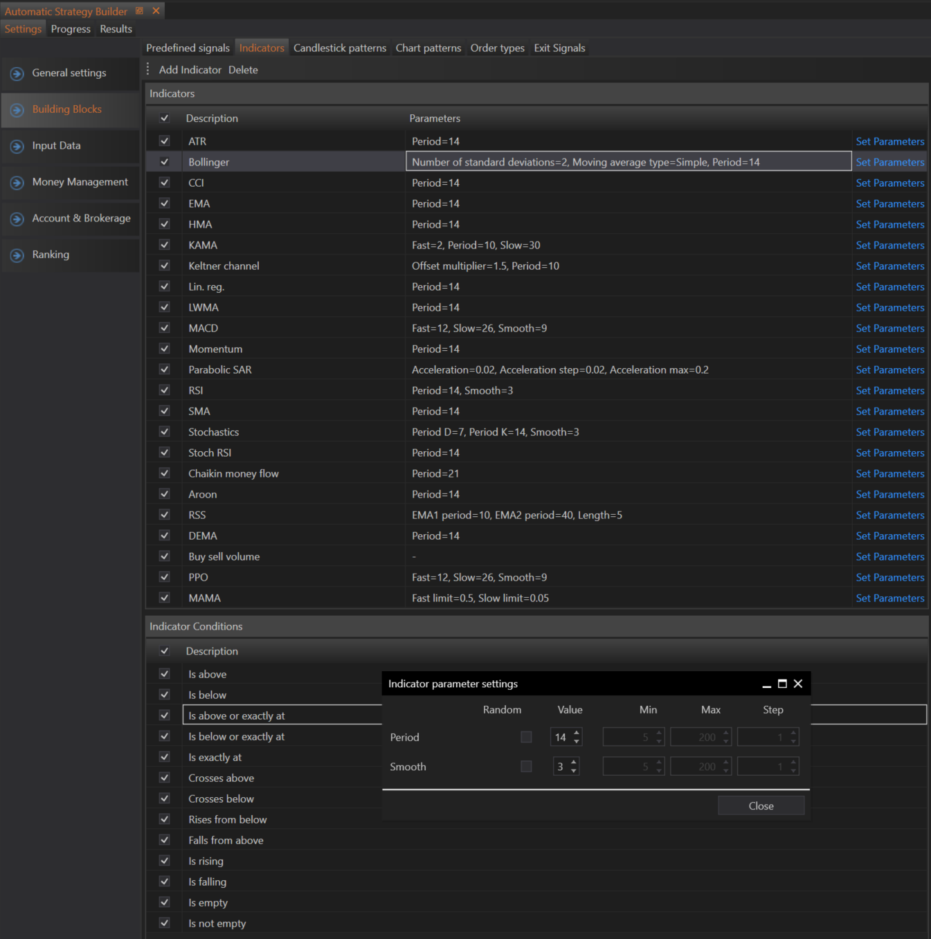 The Indicators table lists various technical indicators available for strategy building. Users can add, remove, or modify indicators and their parameters, similar to the functionality available for predefined signals. Here is a comprehensive list of the available indicators: