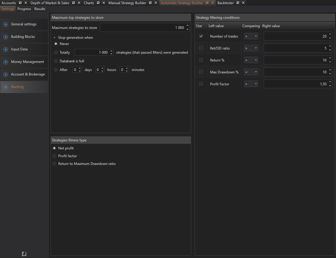 The Ranking section in the Automatic Strategy Builder (ASB) allows users to manage how strategies are generated, stored, and filtered based on specific conditions. This section provides options for defining the number of strategies to store, stopping criteria for strategy generation, filtering conditions, and selecting the type of strategy fitness metrics.
