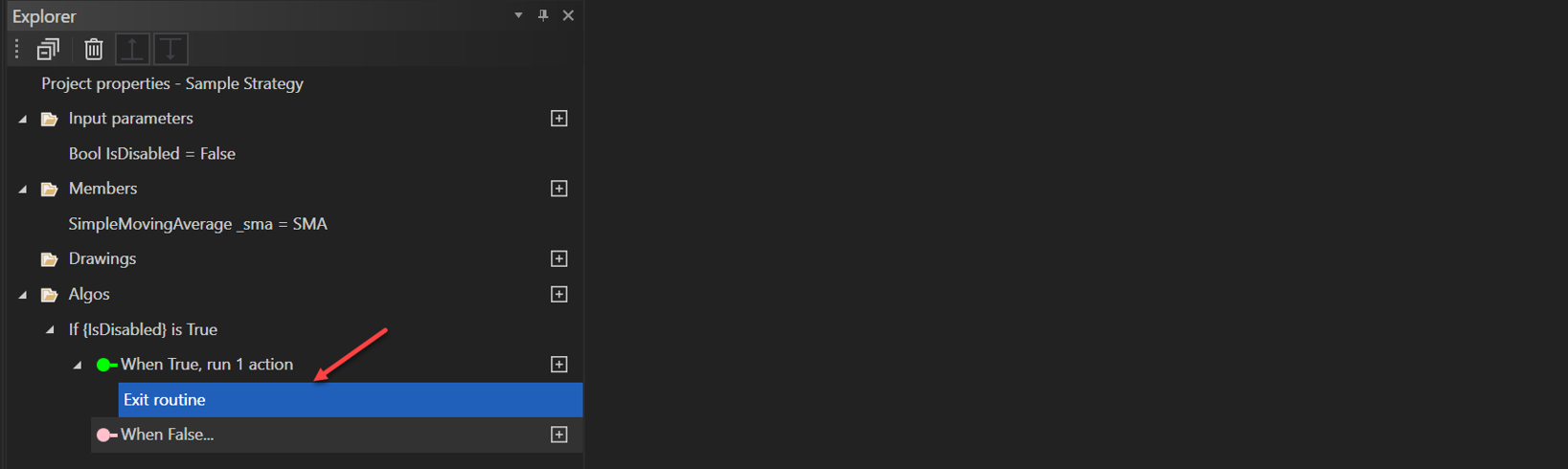 Consider a situation where the strategy should stop processing if a certain condition is met, such as the IsDisabled parameter being true. By placing an Exit OnBarUpdate event handler at the appropriate point in the algo tree, the strategy can exit the OnBarUpdate method as soon as this condition is detected.