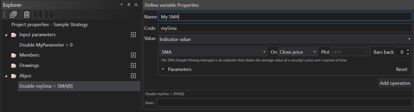 Another way to define an operand is by using the value of an indicator. For instance, the most recent value of a Simple Moving Average (SMA) indicator, referred to as SMA[0], can be used.