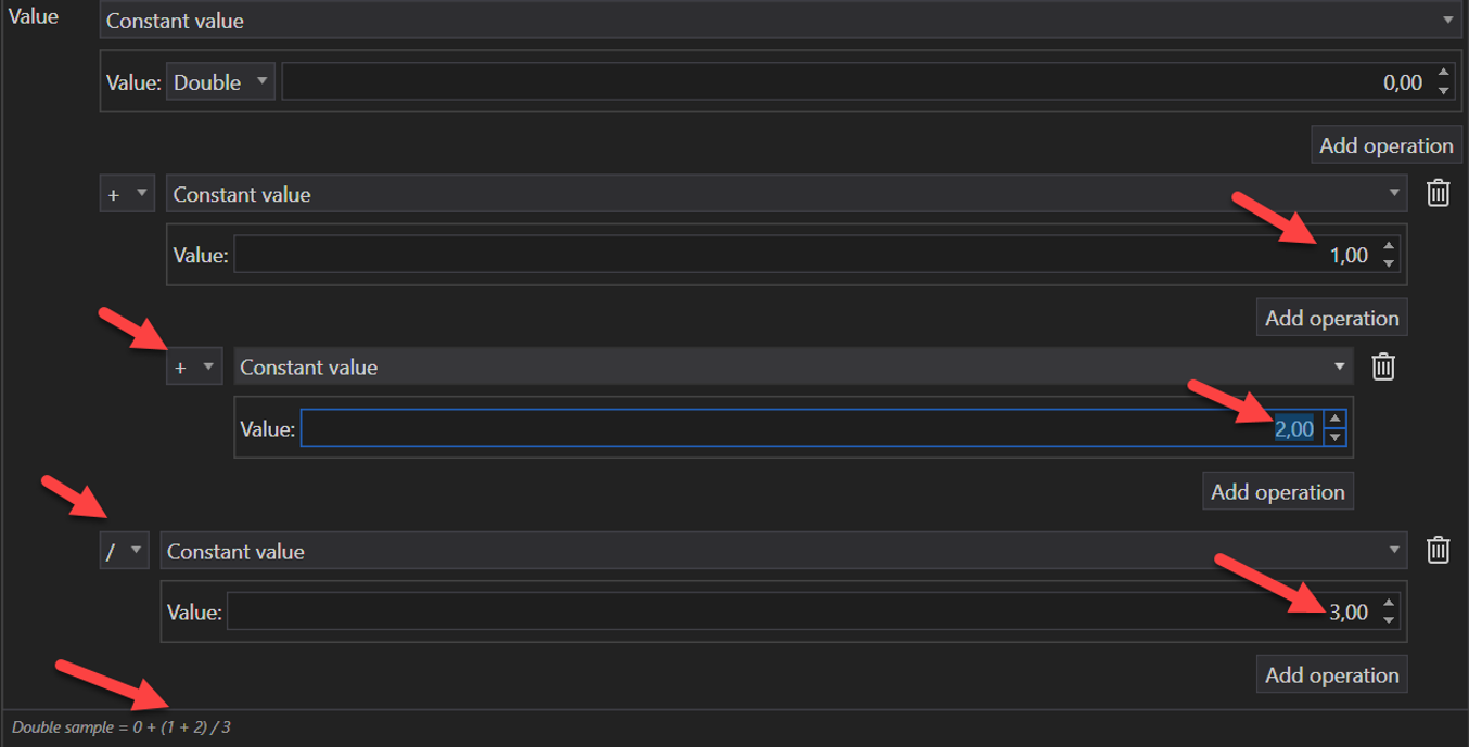 Once a primary value is defined, users can construct complex expressions by adding operations. The "Add Operation" button allows for an unlimited number of operations to be added, enabling the creation of sophisticated expressions. For instance, this setup could create a complex arithmetic expression based on initial constant values and subsequent operations.