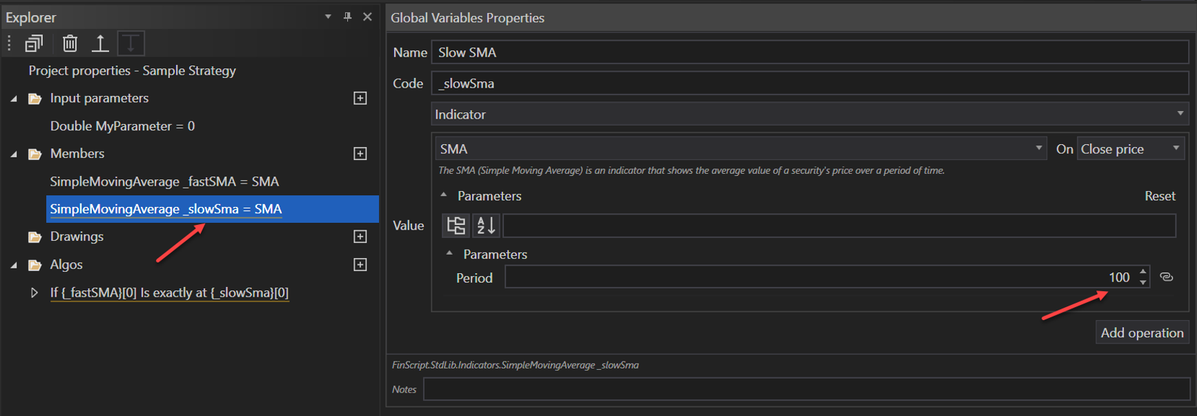 - Create Condition: Use the condition algo element to specify that the fast SMA crosses the slow SMA upwards.