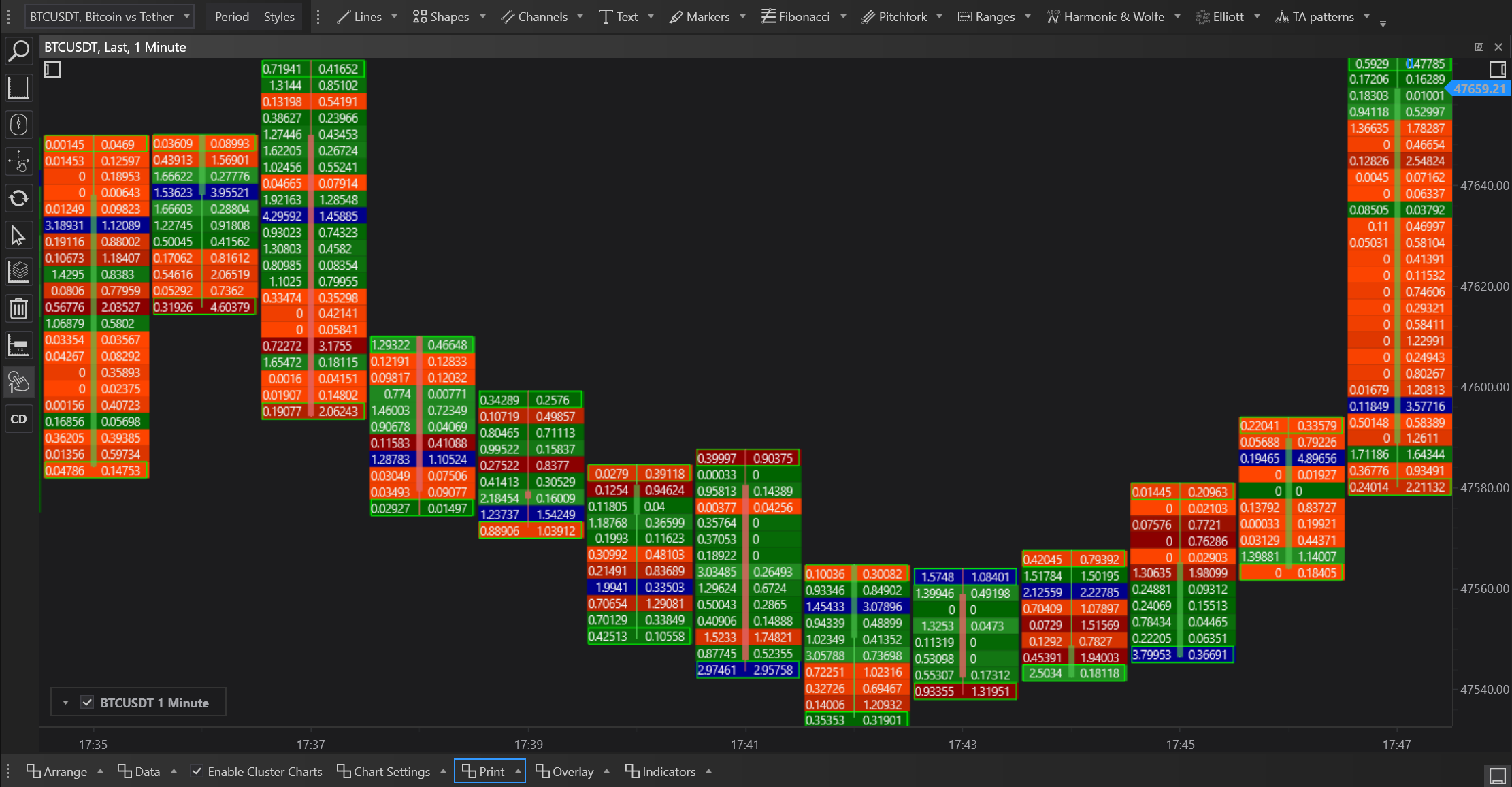 - Data Organization: The chart organizes data into columns that represent time intervals and rows that correspond to price levels. Each cell within the grid shows the volume traded at that price during the specified time.