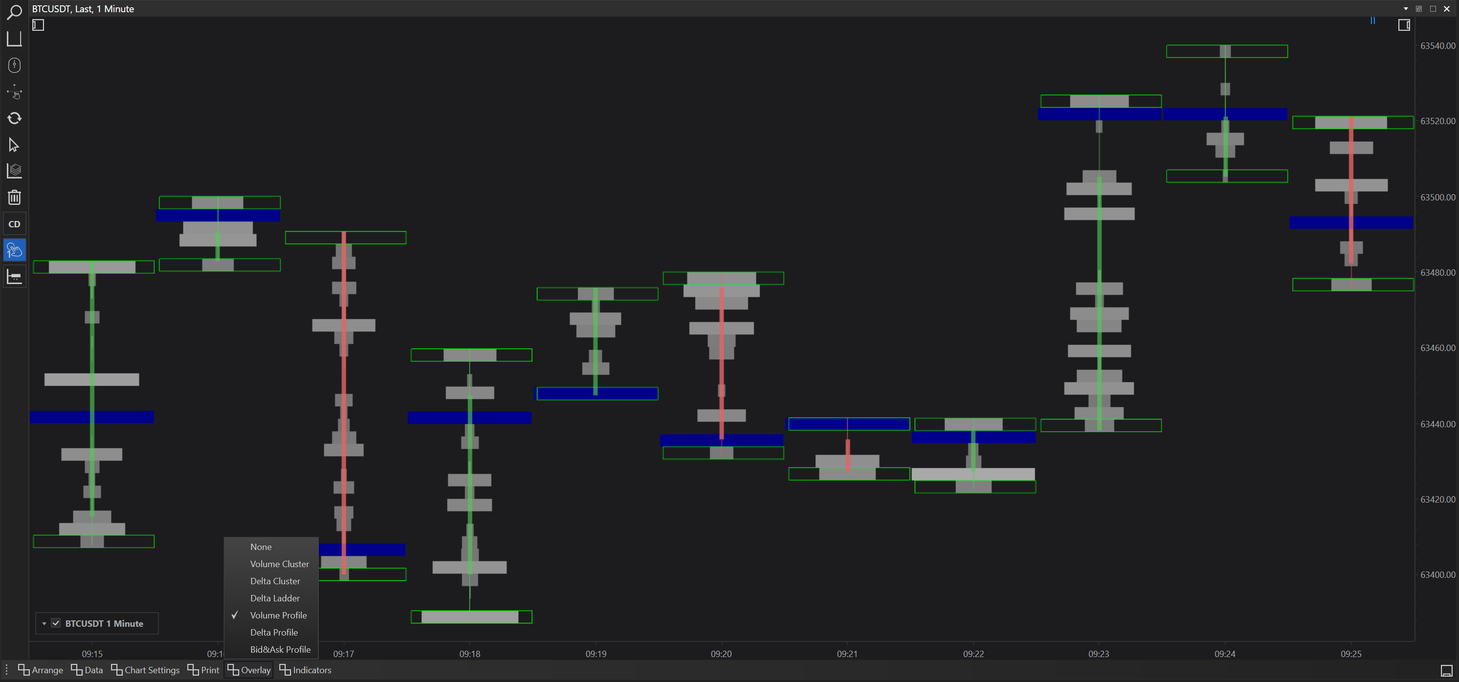 FinStudio's Cluster Charts not only provide detailed data prints on each candle but also allow for the overlay of various analytical tools to enhance market visualization and depth analysis. These overlays help traders to interpret market behavior more effectively by adding layers of data over the basic price action displayed by the candle bar charts. Here, we detail each overlay option available and its applications in trading.