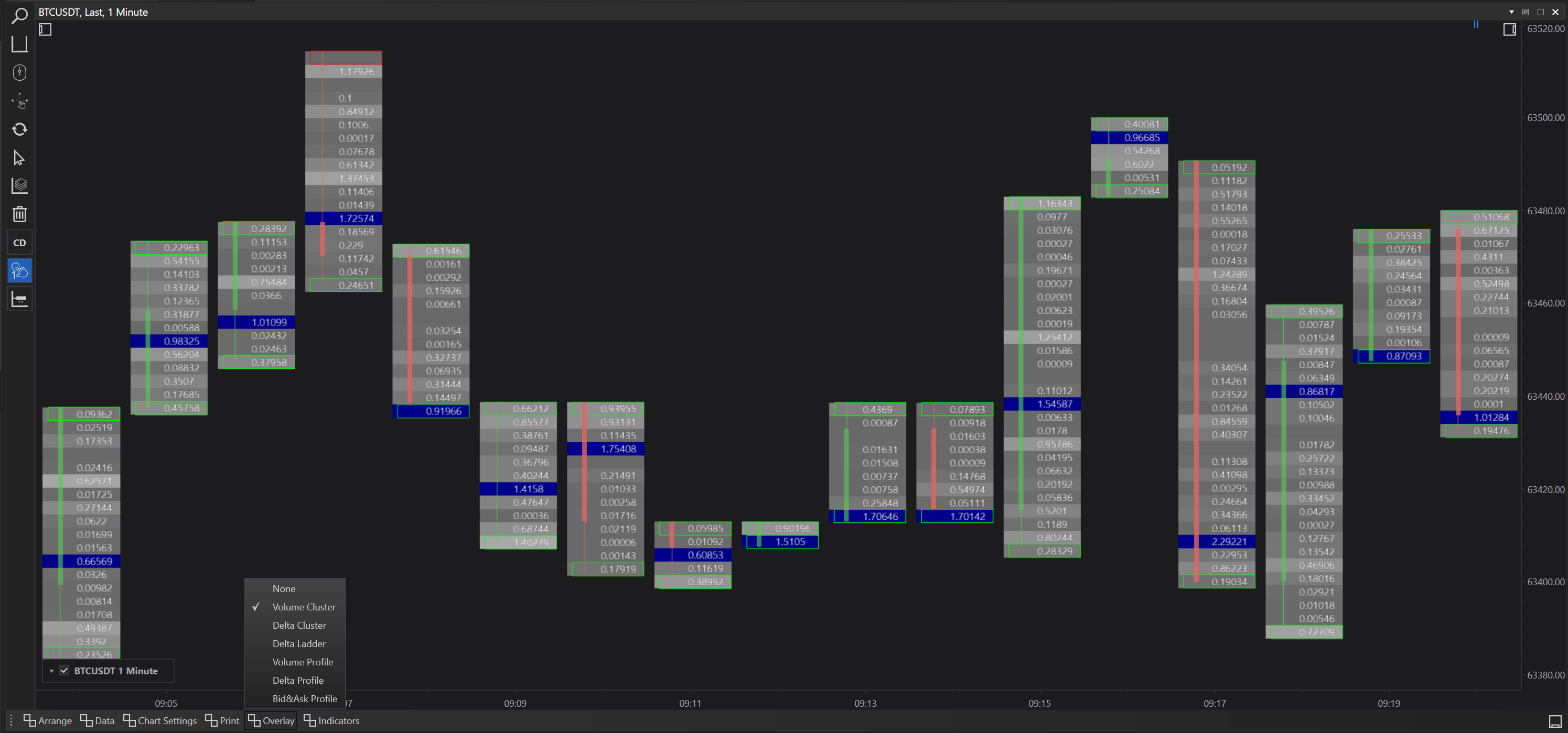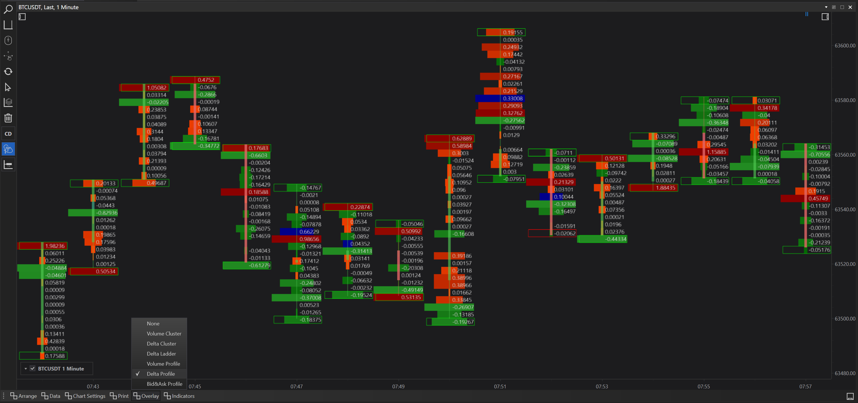 Delta Print with Delta Cluster Overlay: Highlights areas with significant buy or sell pressure by clustering delta values, useful for spotting potential reversal points.