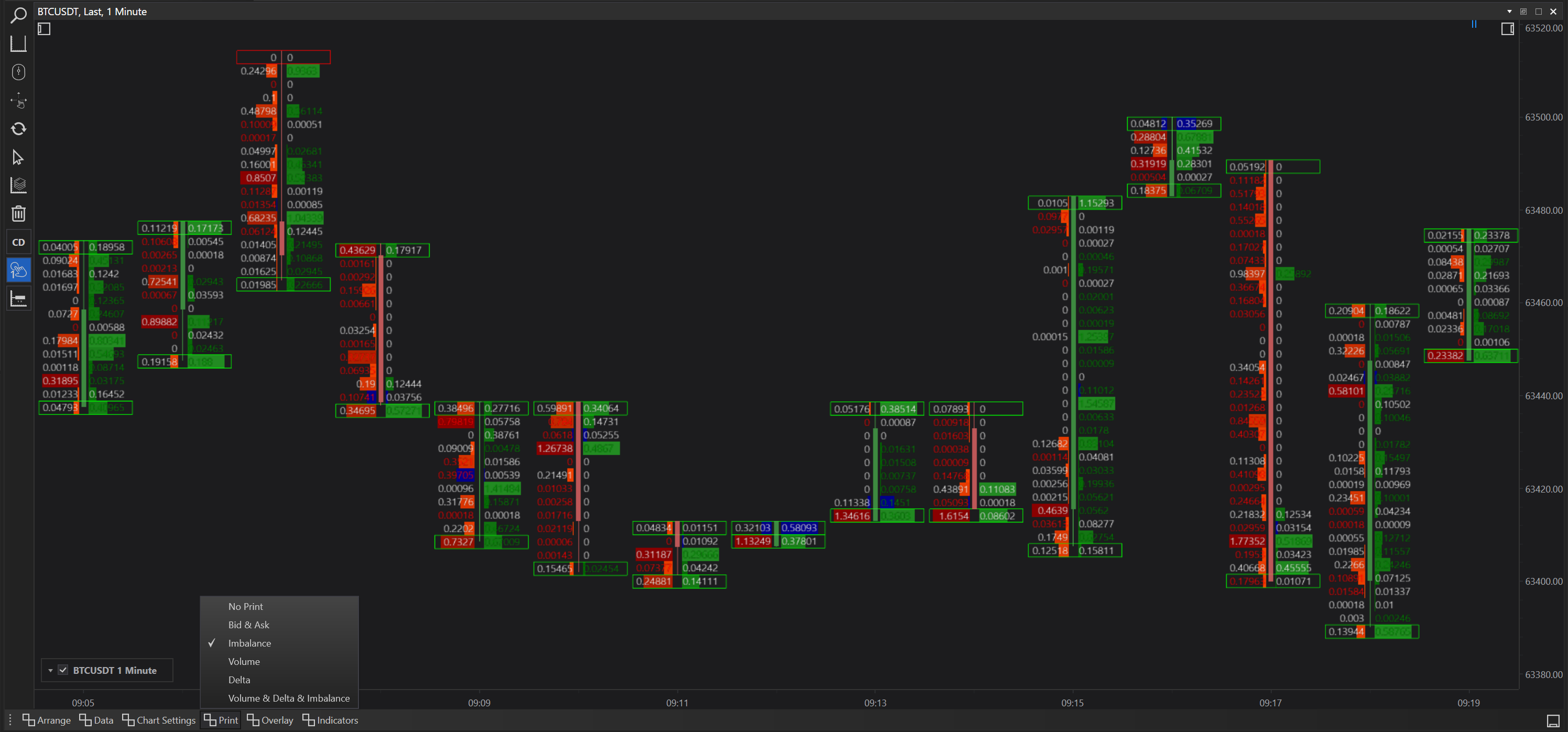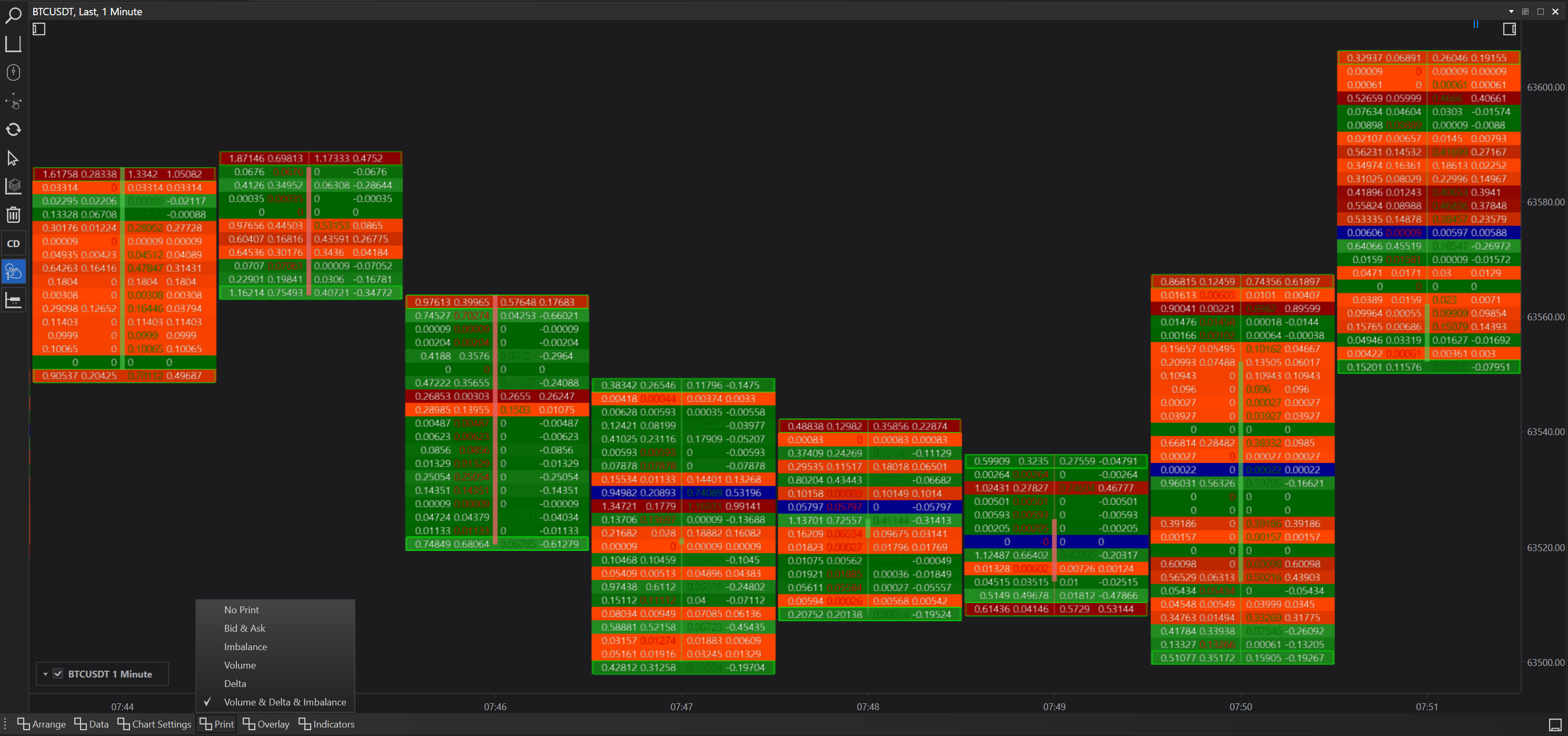 Prints in cluster charts refer to the type of data visualized directly on the chart's candles or bars. These prints can provide detailed insights into various aspects of trading activity within each bar. The available prints in FinStudio include:
