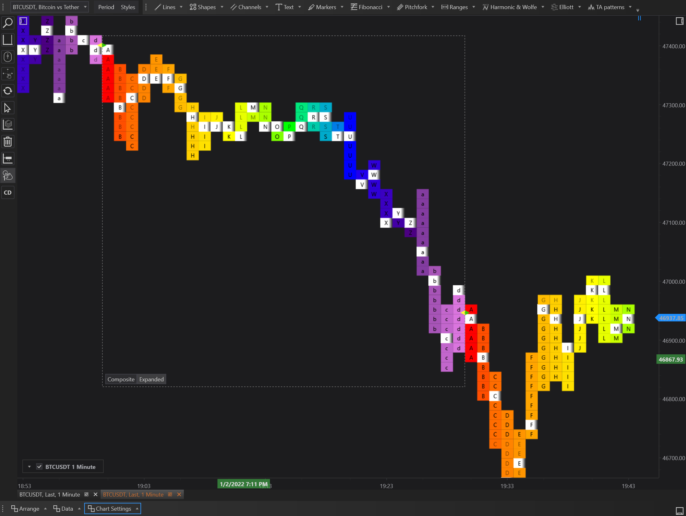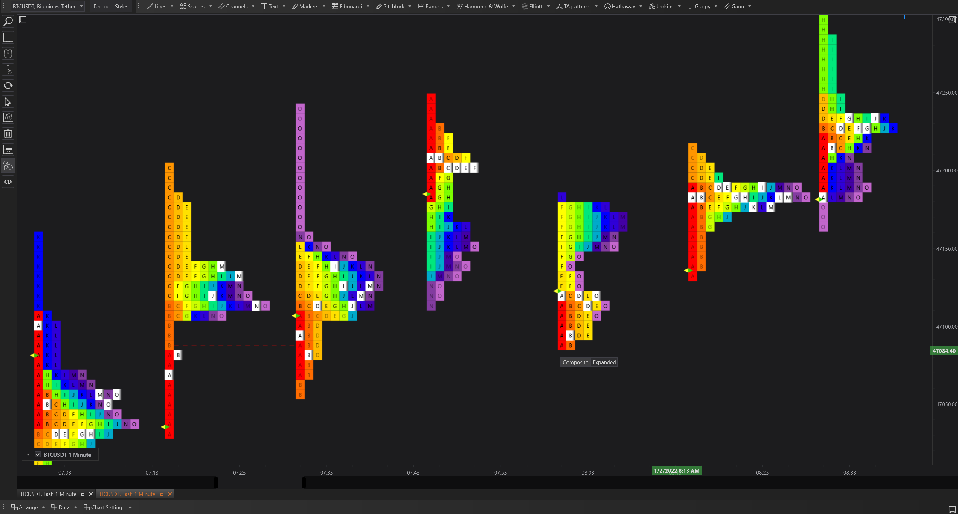 - Detailed Letter Representation: Even though the data is aggregated, each price level still shows the letters representing different trading periods, allowing analysts to see the time-based distribution of trading volume within the broader context.