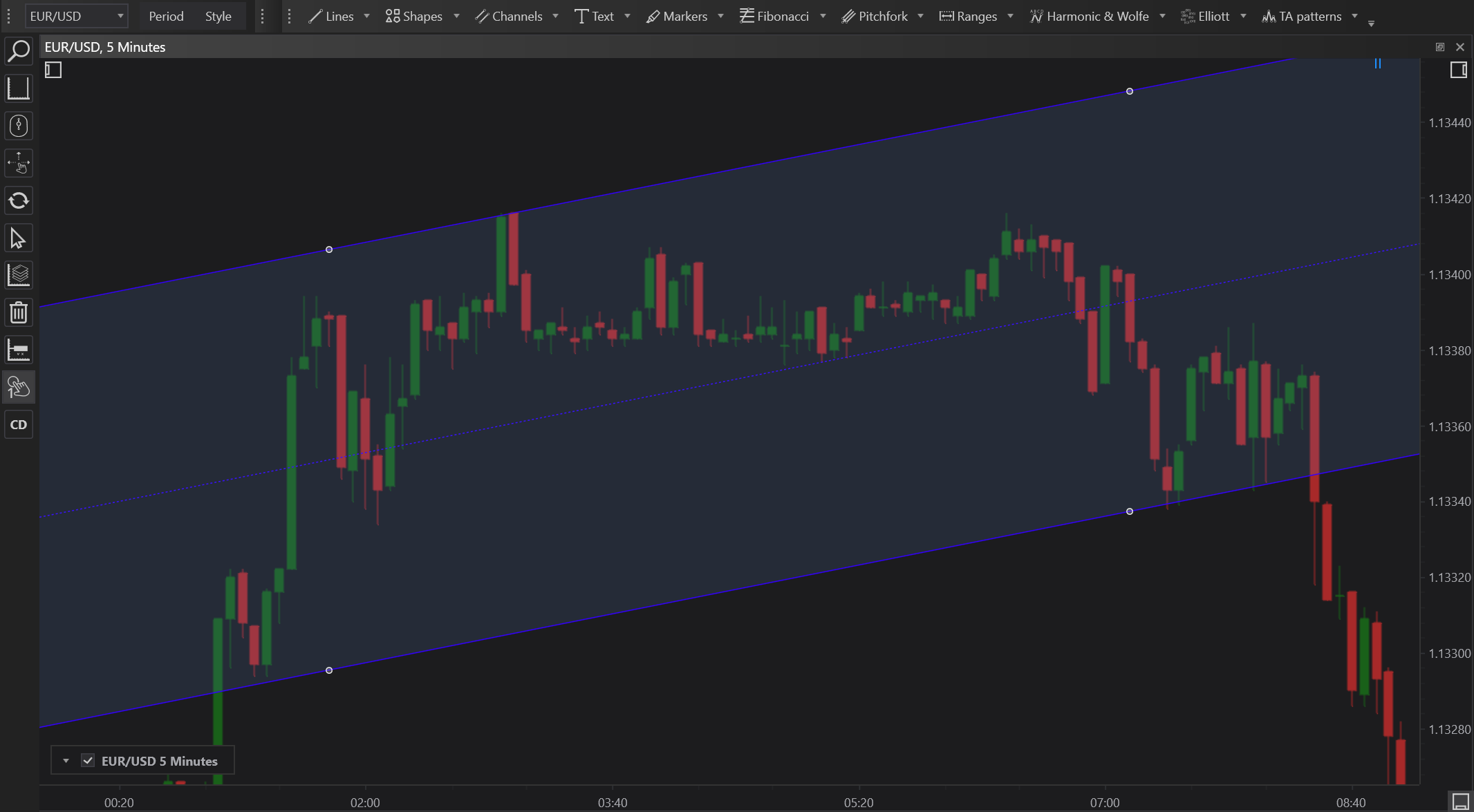 - Set the Channel Width and Length: Extend the line to another significant point to set the width, then drag beyond the initial placement to project future price pathways. The platform automatically draws and extends parallel lines.