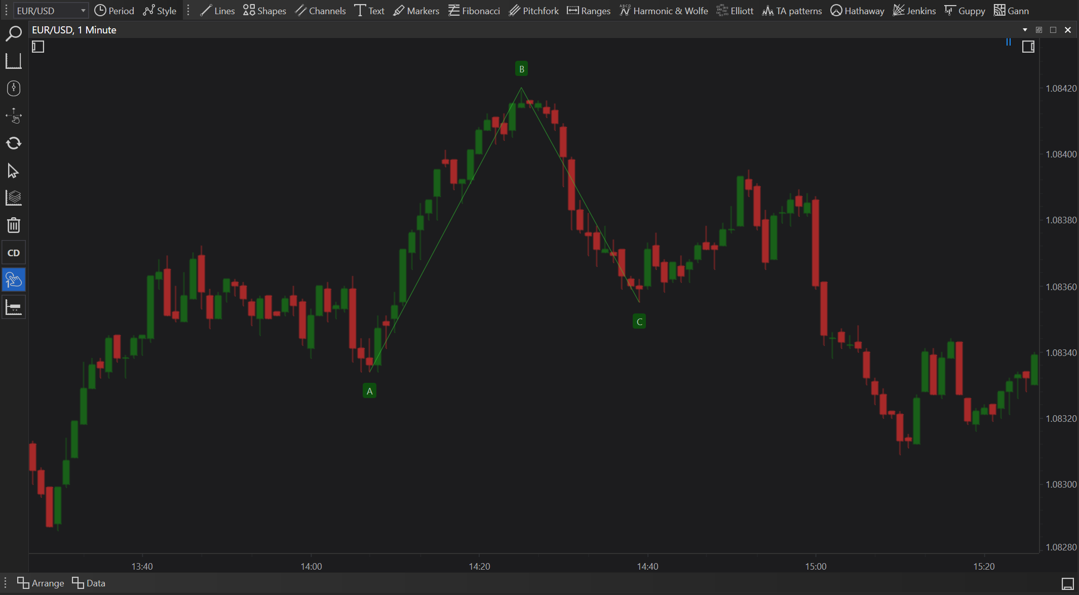 - Use: Traders use these tools to recognize corrective patterns, which can signal continuations or reversals of trends. Identifying A B C patterns allows traders to strategically position for the resumption of the trend or prepare for a potential reversal.