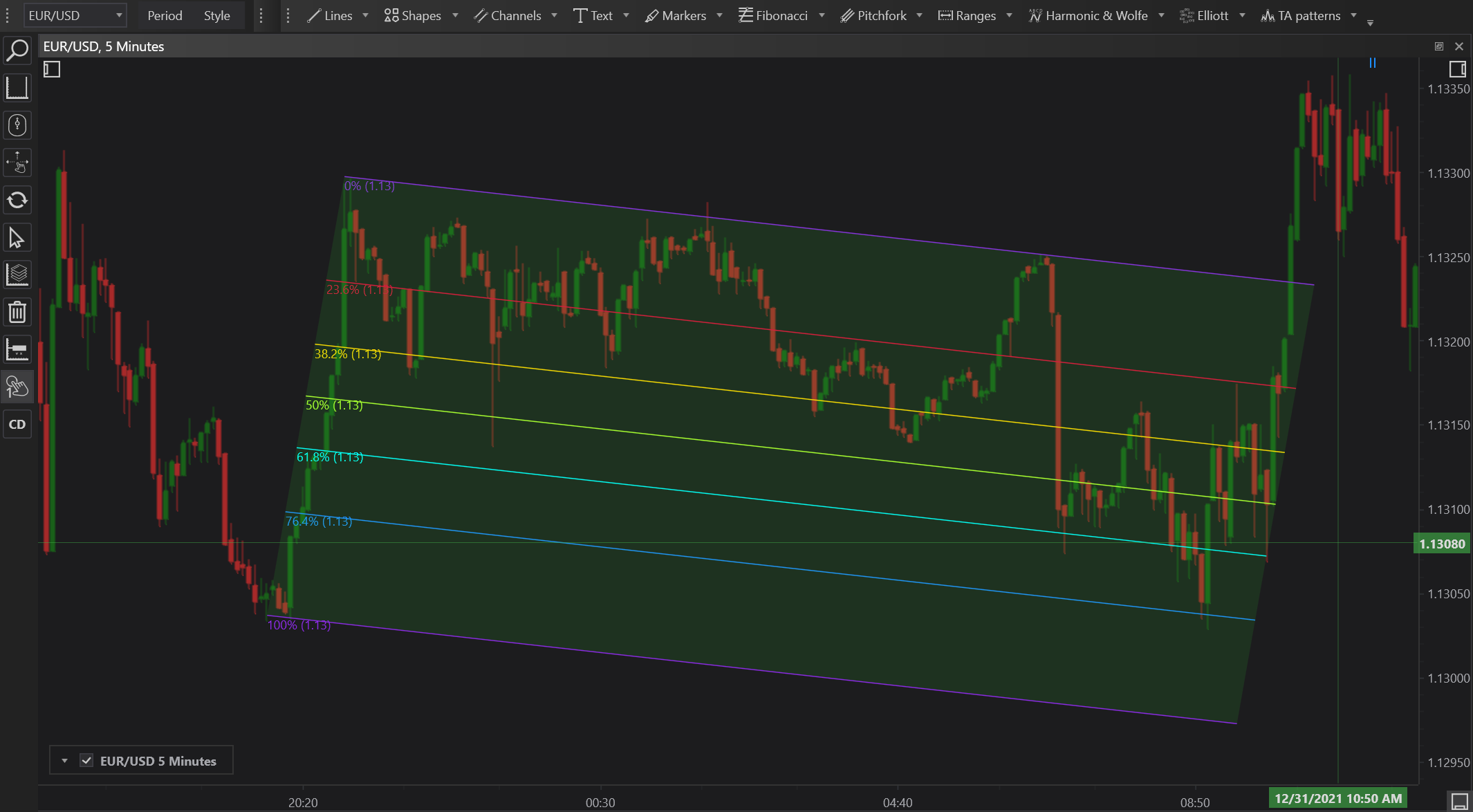 - Channel Generation: Once the initial line is set, the tool automatically generates parallel lines at the key Fibonacci levels (e.g., 23.6%, 38.2%, 50%, 61.8%, and 100%). These lines extend from the base line, projecting potential future support and resistance levels.