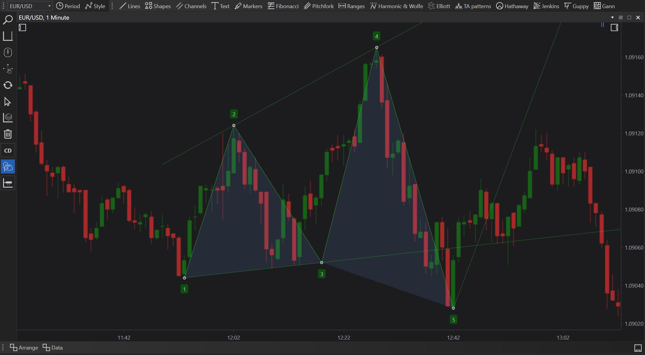- Drawing the Pattern: Progressively mark the critical points that form the Wolfe waves, including points 1 through 5, adhering to the specific geometric criteria characteristic of Wolfe Waves.