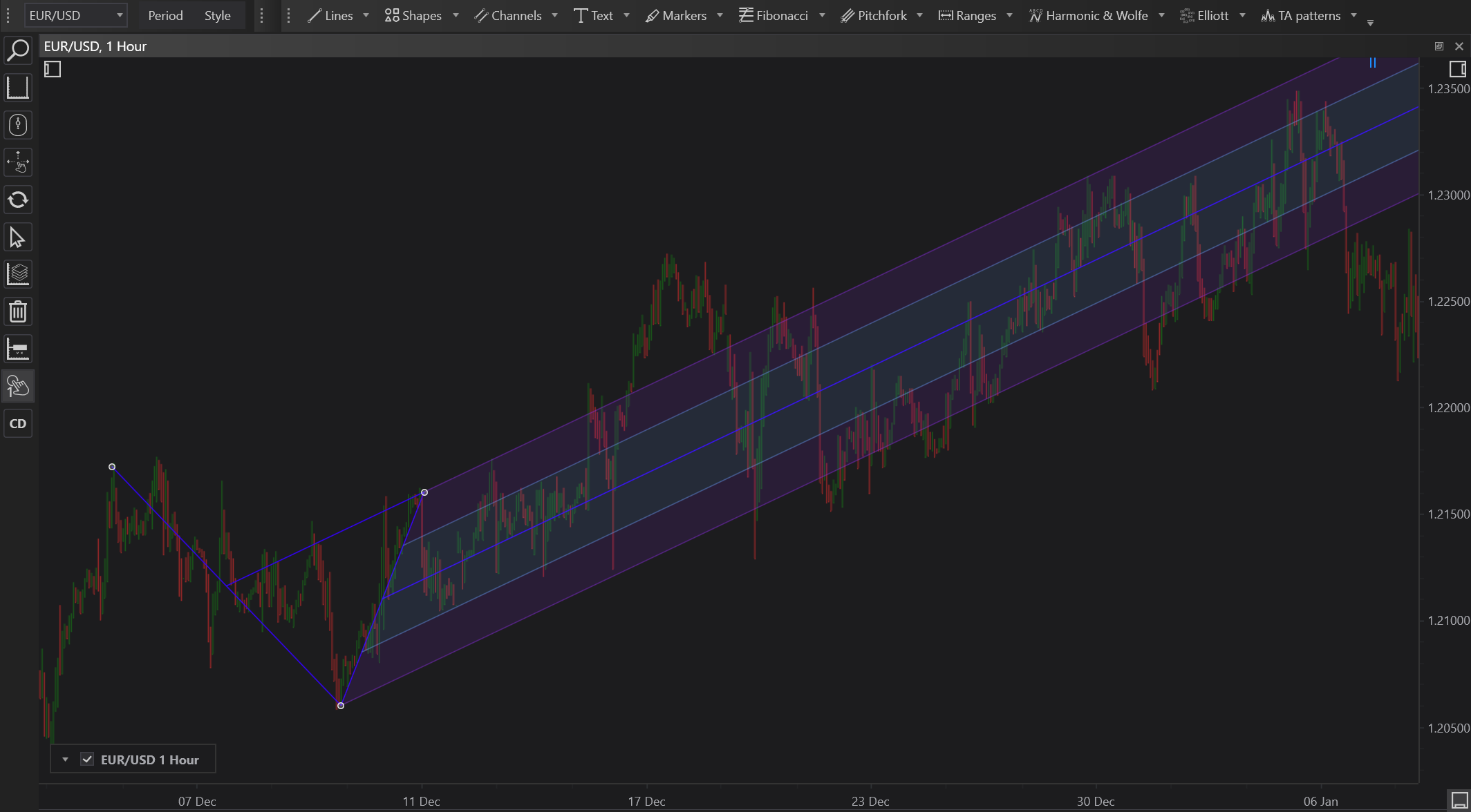 The Inside Pitchfork tool in FinStudio stands out for its detailed approach to trend analysis. By concentrating on the internal segments of market movements, it allows traders to harness fine-grained data for better-informed trading decisions. This tool is especially valuable for those looking to enhance their precision in identifying and reacting to subtle market signals, making it a crucial addition to the technical trader’s arsenal.