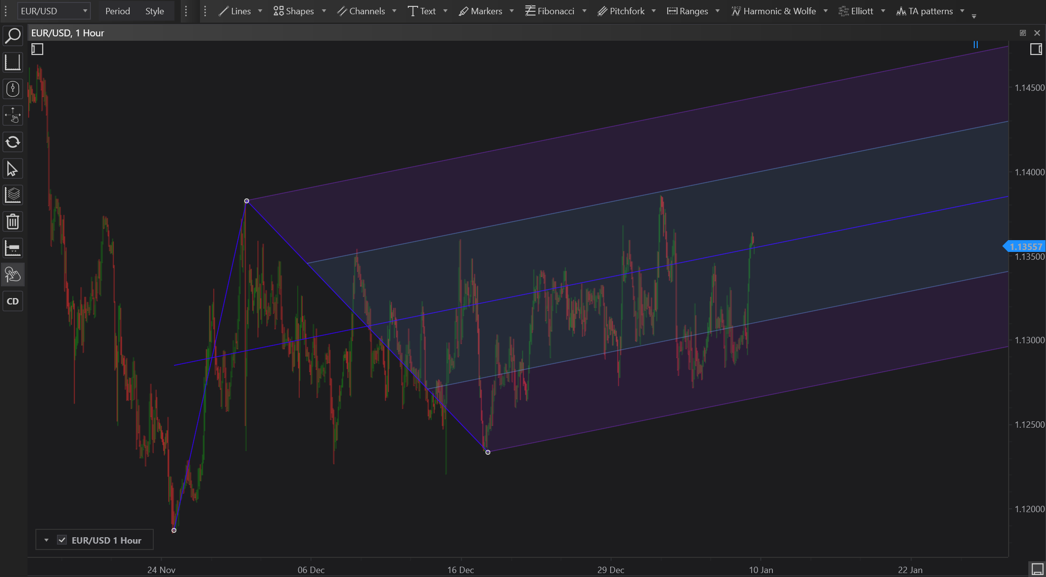 The Schiff Pitchfork is an adaptation of the standard pitchfork tool, offering a modified perspective on potential price channels. This tool shifts the baseline of the traditional pitchfork to provide a deeper insight into market trends and potential reversals. It is favored for its nuanced approach to market dynamics, particularly in volatile trading environments.