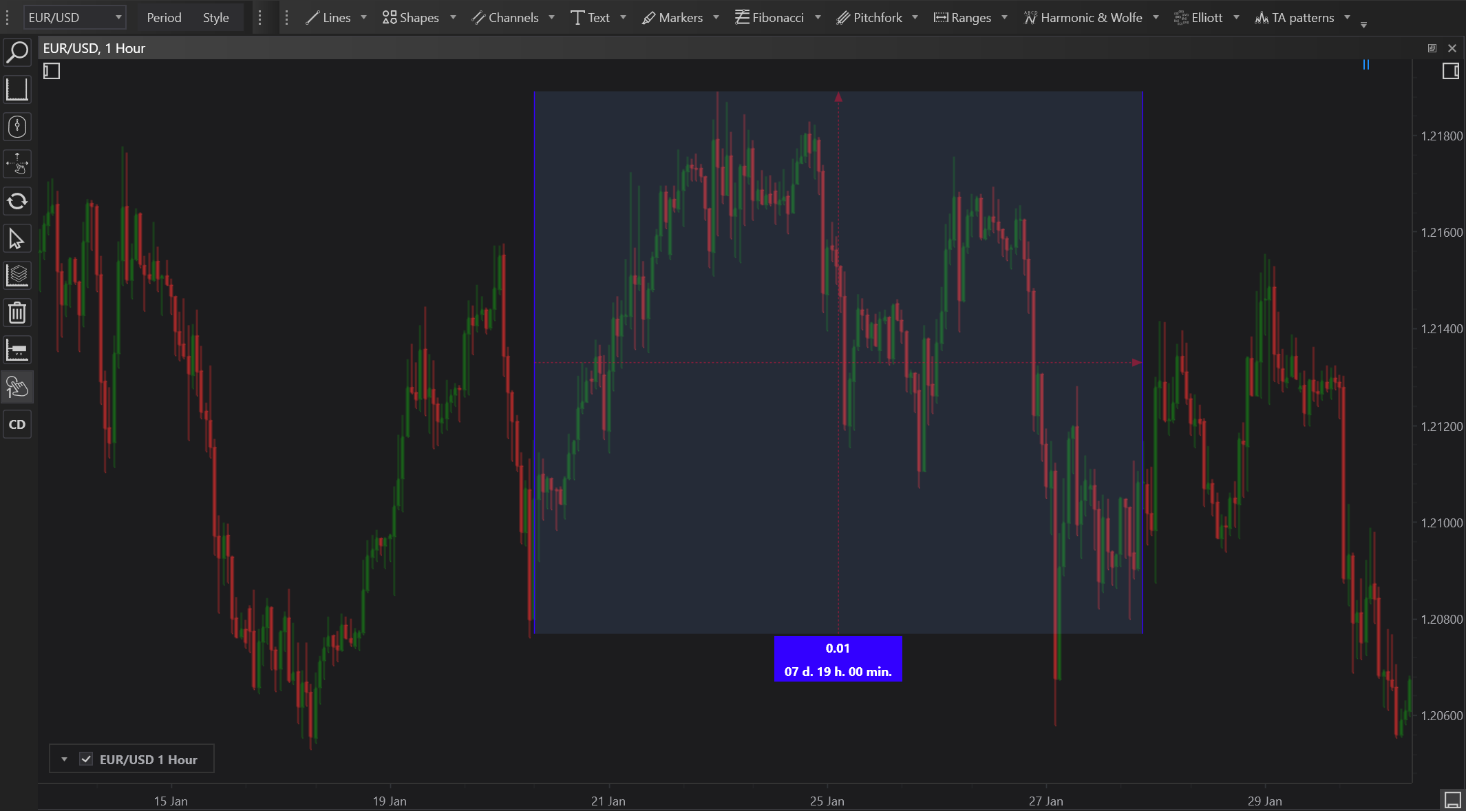 - Extending the Tool: Drag the tool to another significant point on the chart to mark the end of the range. This will automatically display both the time interval and the price difference between the start and end points.