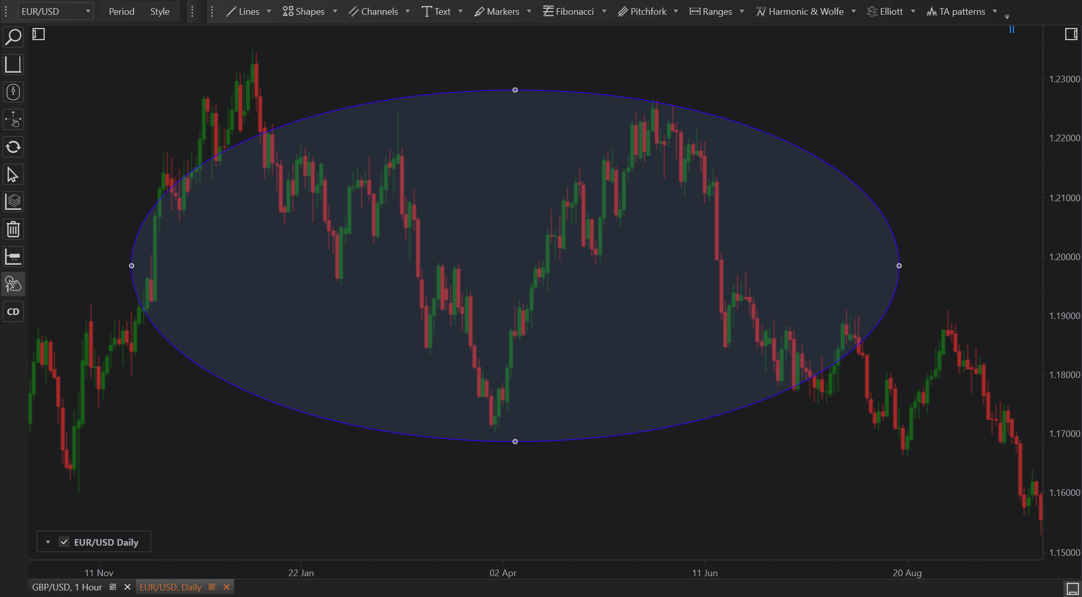 - Place the Ellipse: Click and drag on the chart to draw the ellipse around the desired area. The initial click defines the starting corner of the bounding rectangle of the ellipse.