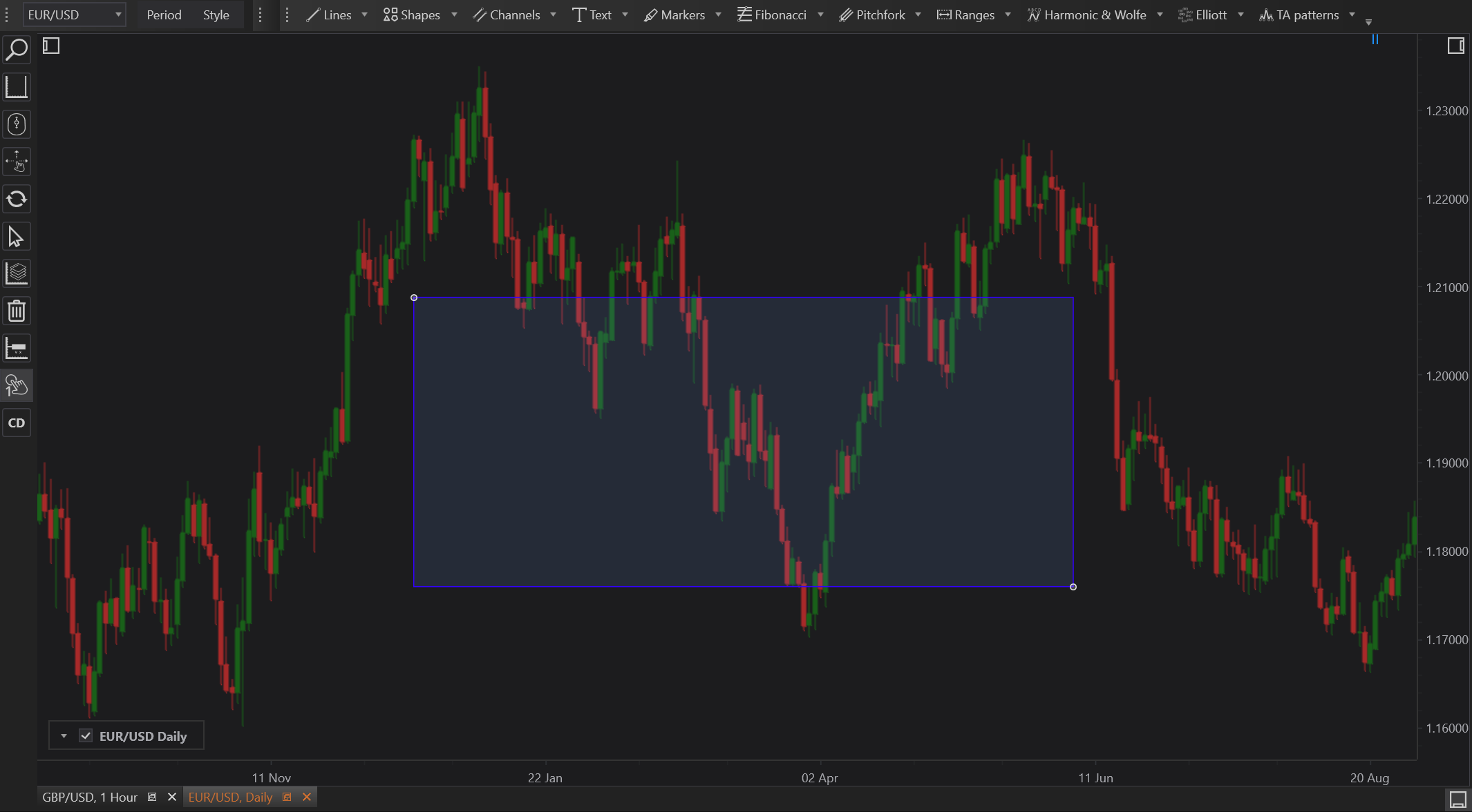 - Refine Positioning: The corners of the rectangle can be adjusted after placement to fine-tune its position and dimensions as market conditions change or more information becomes available.