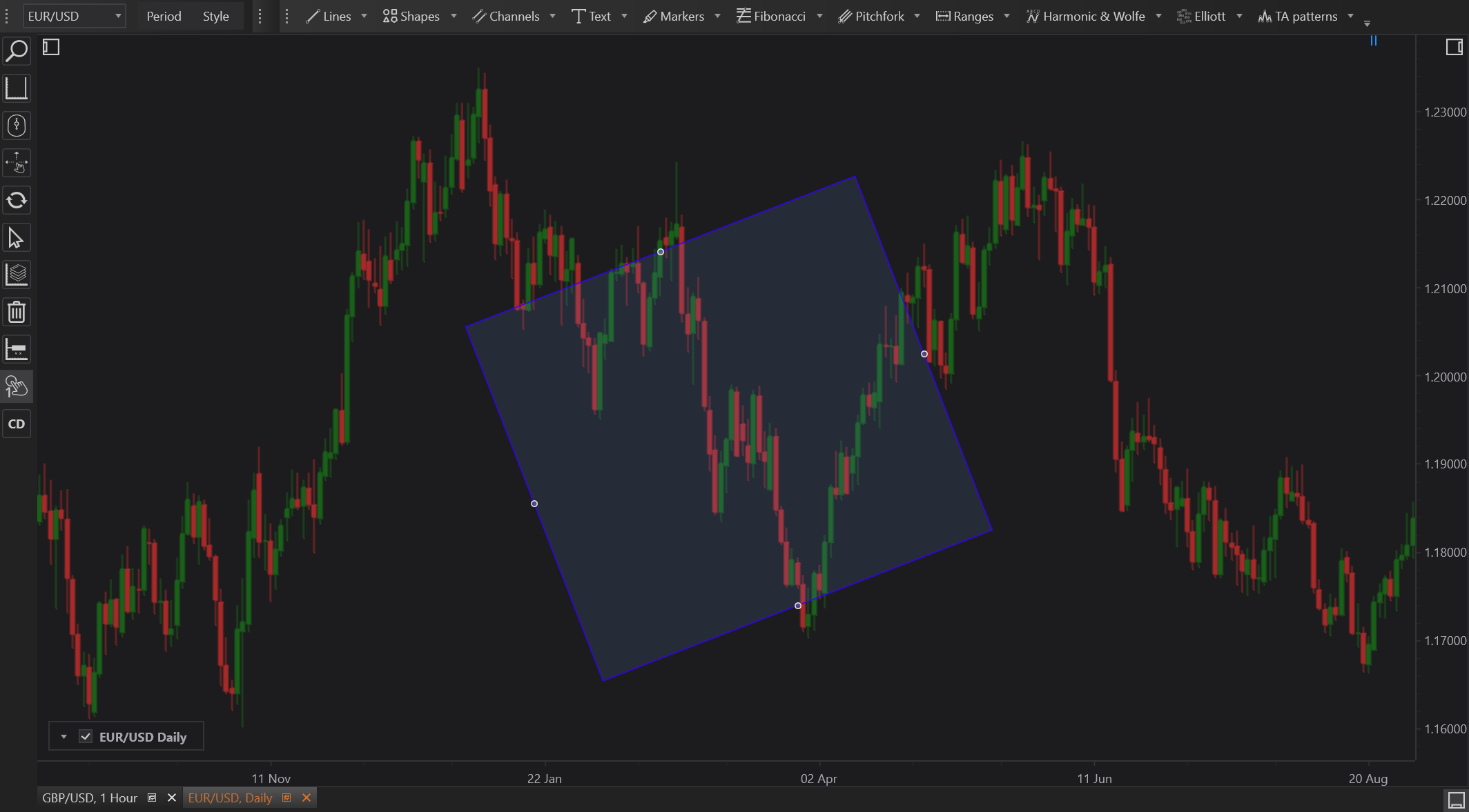 The Rotated Rectangle tool in FinStudio is an essential asset for technical traders who need to adapt their chart markings to the dynamic nature of market price movements. By allowing for rotation and flexible adjustment, this tool caters to a sophisticated level of chart analysis, aligning perfectly with diagonal trends and patterns. Its use enhances the trader's ability to visually track and analyze patterns that deviate from standard horizontal or vertical orientations, making it a valuable tool for detailed technical analysis.