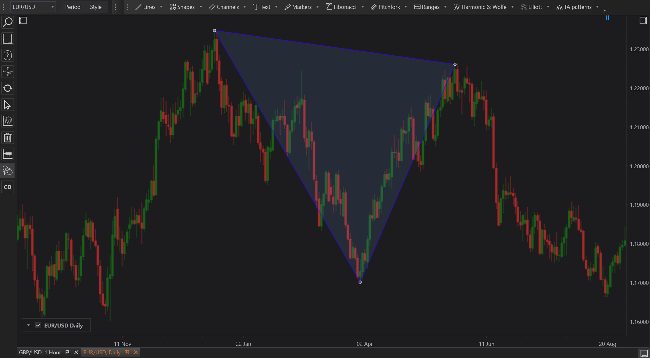 - Drawing the Triangle: Click to place the initial point on the chart, and then click again to define the second and third points, forming a triangle.