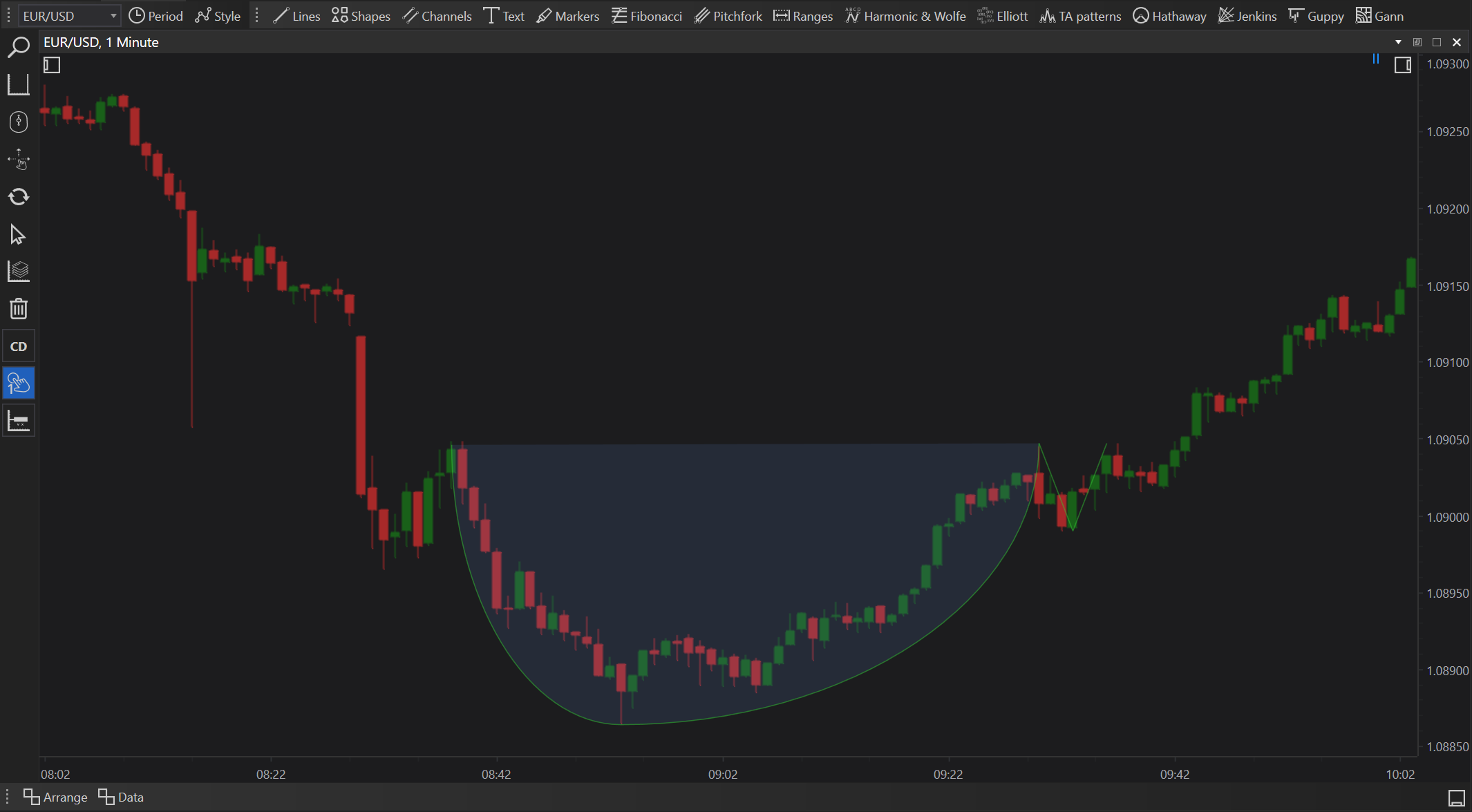 Select the Tool: Traders can access the Cup & Handle tool from the drawing tools menu in FinStudio and apply it directly to a chart where a potential pattern may be forming.