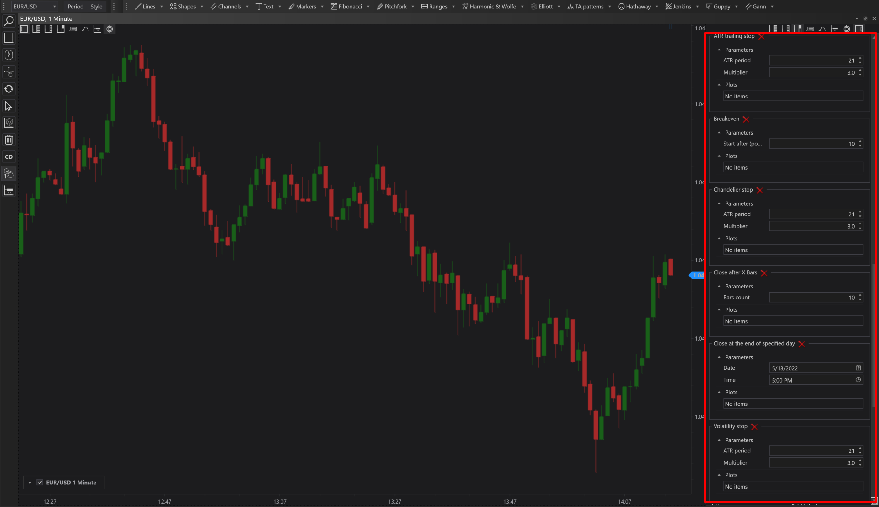 The Chandelier Stop is an advanced exit strategy used within our Trading Panel to protect profits by setting dynamic stop-loss levels. This method uses the volatility of the market, measured by the Average True Range (ATR), to determine where to place stop losses for both long and short positions.