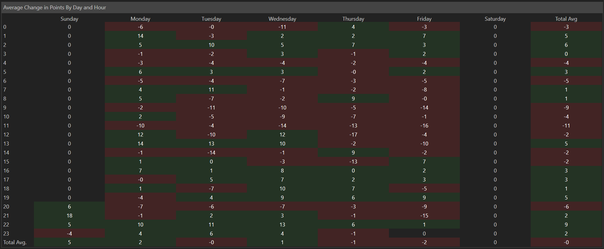 - Definition: Details the average change for each day and hour, offering a granular view of when the instrument typically experiences the most substantial price movements throughout the trading day.