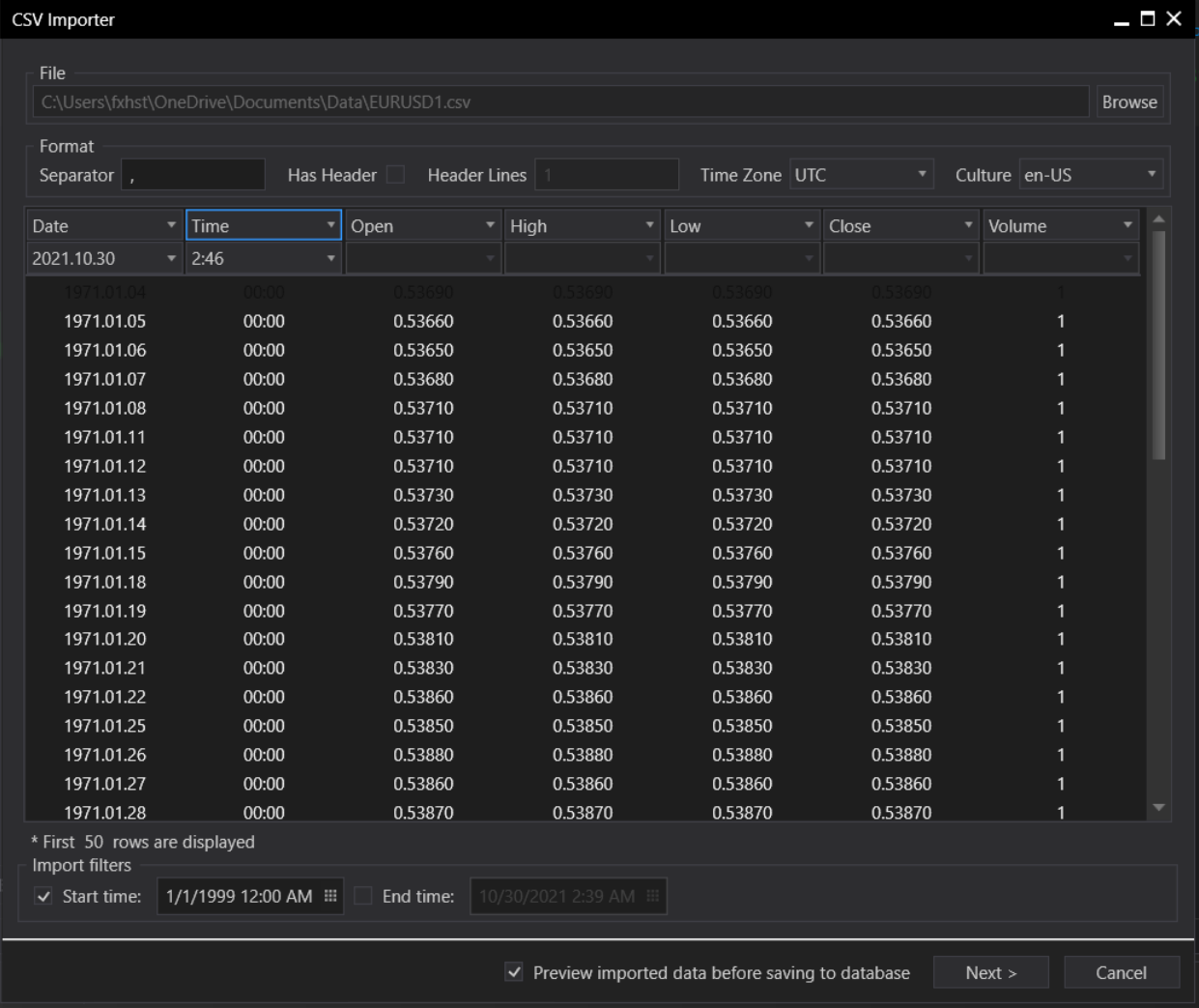 Users have the option to select a specific starting period for downloading historical data from their provider. To initiate the download, both a starting and an ending period must be defined. It's important to note that the extent of available data is limited to what the provider can offer. Selecting an earlier start date than what the provider supports will result in data being downloaded only from the earliest date available from that provider.