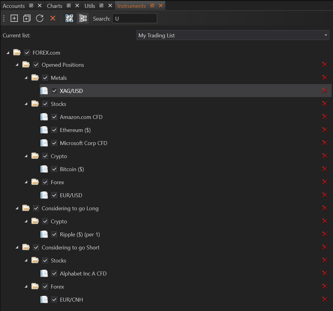 This level of customization allows users to design their instrument lists and groups with virtually no restrictions, limited only by their creativity. For instance, users can assemble an instrument list that includes various custom groups tailored to their specific analytical or trading needs.