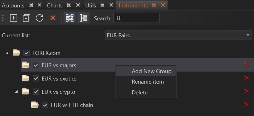 Instrument lists offer a flexible way to personalize and organize financial instruments into tailored lists and groups. To begin, users need to create a new instrument list, which serves as a foundation for further customization and categorization according to their preferences. This capability allows users to create a highly personalized and efficient trading environment.