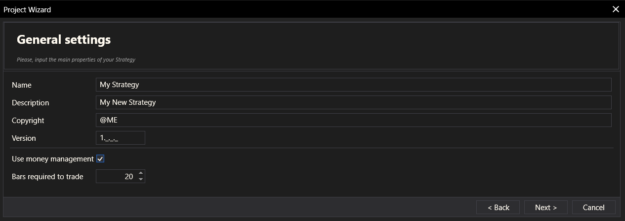 In the General Settings step, the user inputs the basic properties of the strategy: