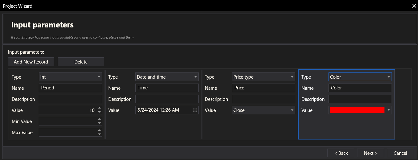 In this step, the user can add or delete input parameters for the strategy. Each parameter includes: