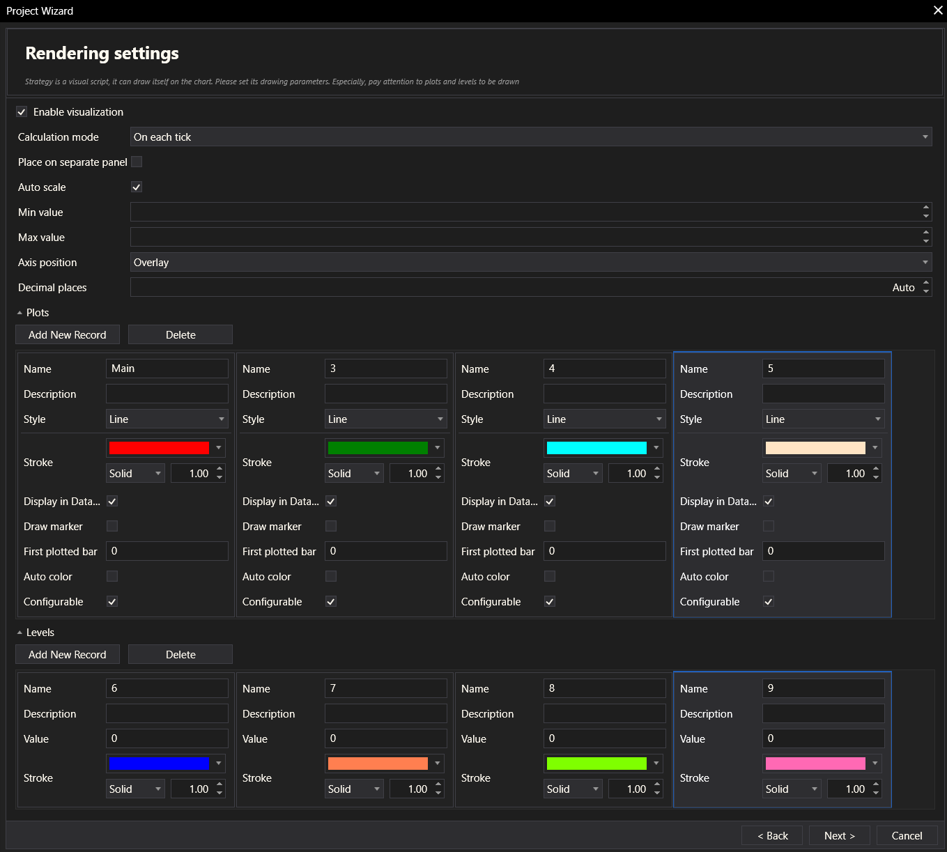 The Rendering Settings step allows the user to define how the strategy is visually represented: