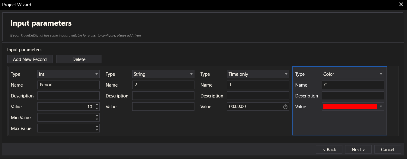 In this step, the user can add or delete input parameters for the trade exit signal. Each parameter includes: