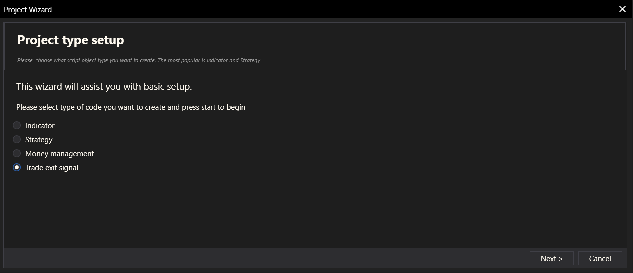 In this initial step, the user selects the type of project they want to create. For this guide, we will focus on creating a Trade Exit Signal.