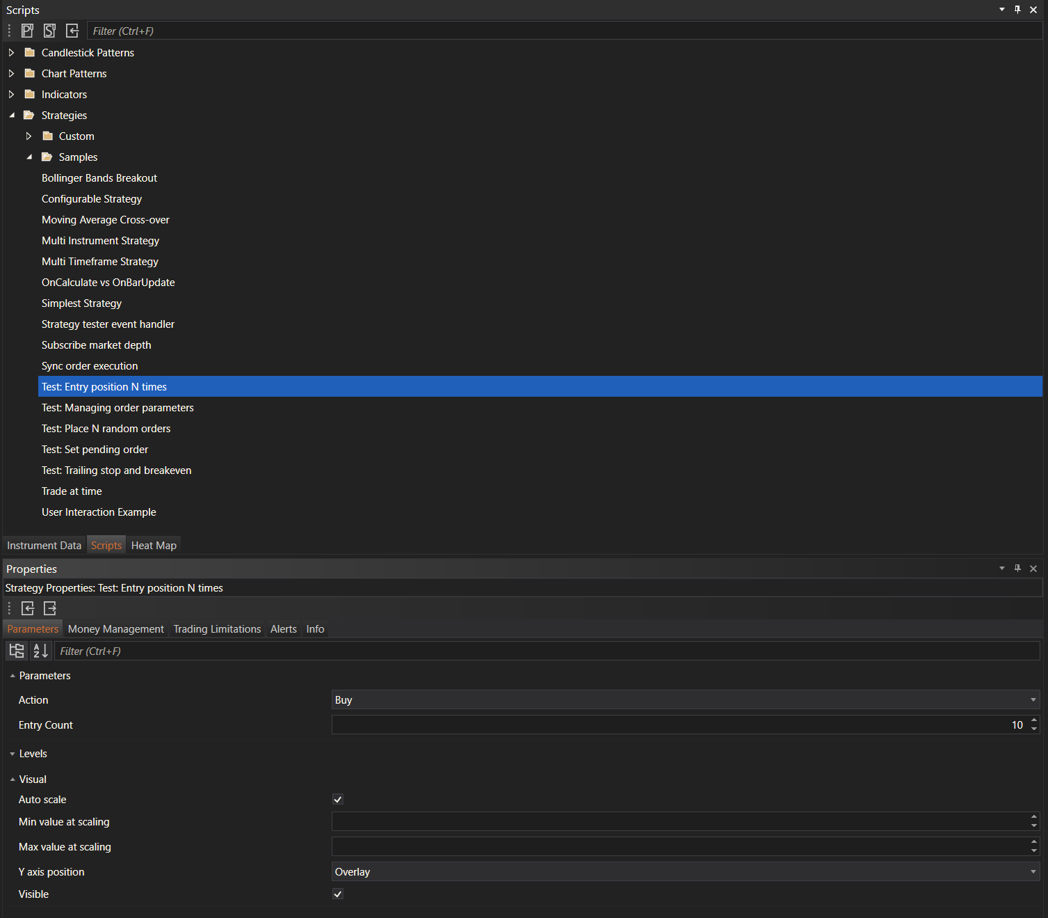 The example interface provided shows how scripts are organized within the module. It includes a list of sample strategies, such as Bollinger Bands Breakout, Configurable Strategy, and Multi Timeframe Strategy. Upon selecting a script, users can see and edit its properties in the Properties pane below.