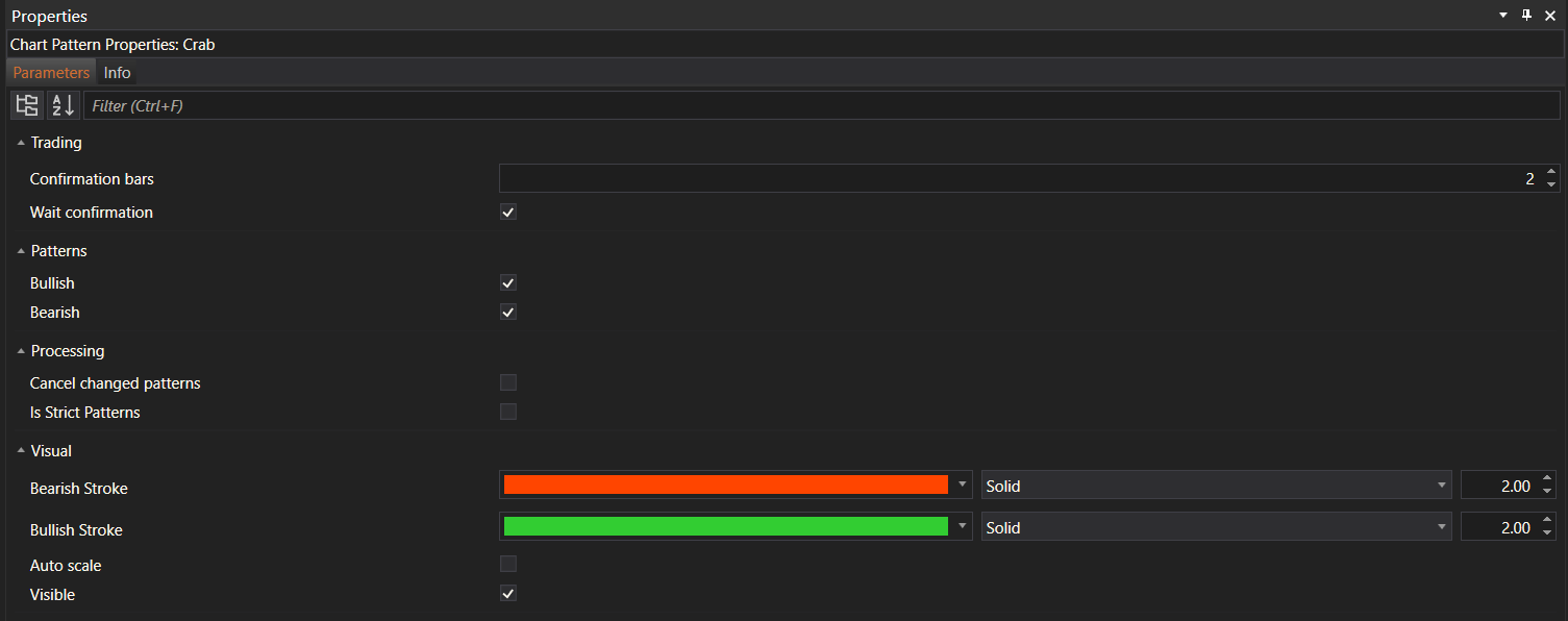 The Properties page for Chart Patterns provides detailed settings that allow users to customize the behavior and appearance of chart pattern scripts. The Properties page is divided into two main tabs: Parameters and Info.
