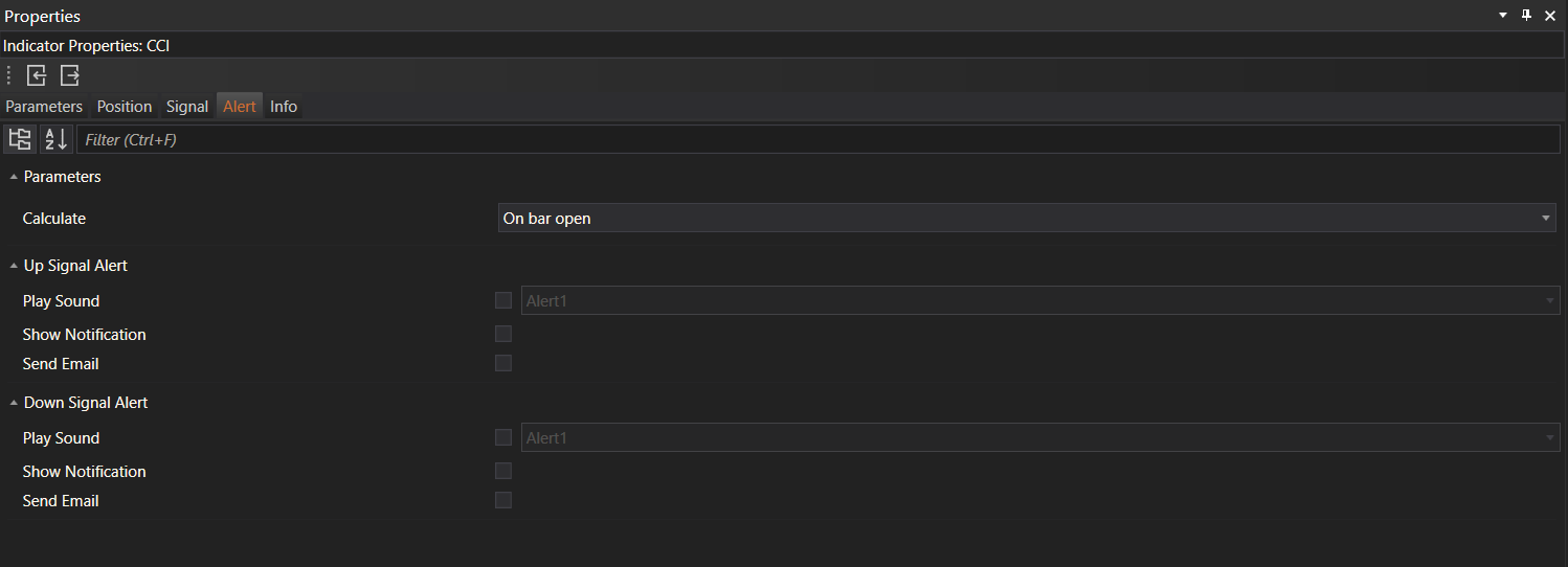 The Alert tab within the Properties window of the Indicators in the Scripts module allows users to configure alerts for specific signal conditions. These alerts can notify the user through various means when certain conditions are met. Below is a detailed explanation of the options available in the Alert tab.