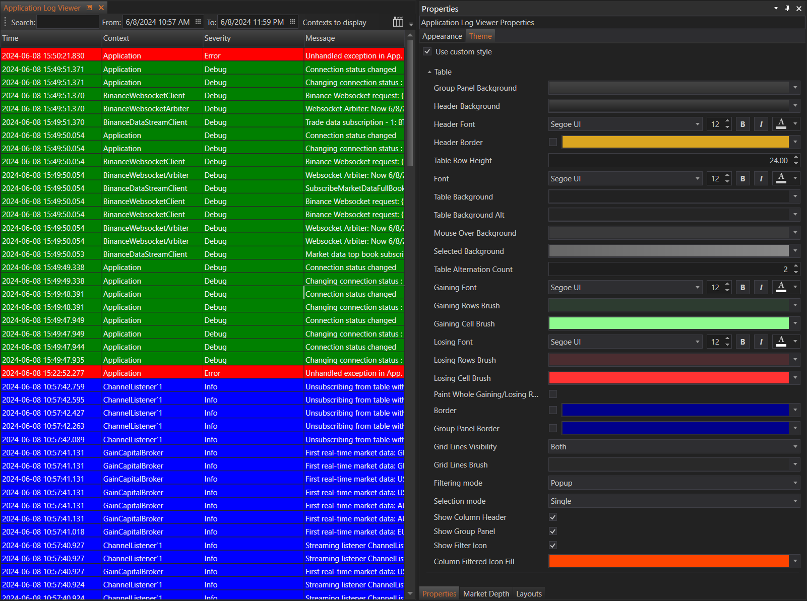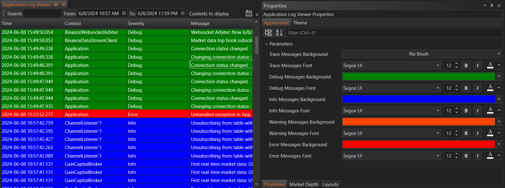 The Properties section for the Log Viewer module provides users with the flexibility to tailor the appearance of the log messages to their liking. By adjusting settings in the Appearance tab, users can differentiate between message types through customized backgrounds and fonts. The Theme tab allows for broader visual adjustments, enhancing the overall user experience. These customization options ensure that users can create a comfortable and efficient working environment within the Log Viewer module.