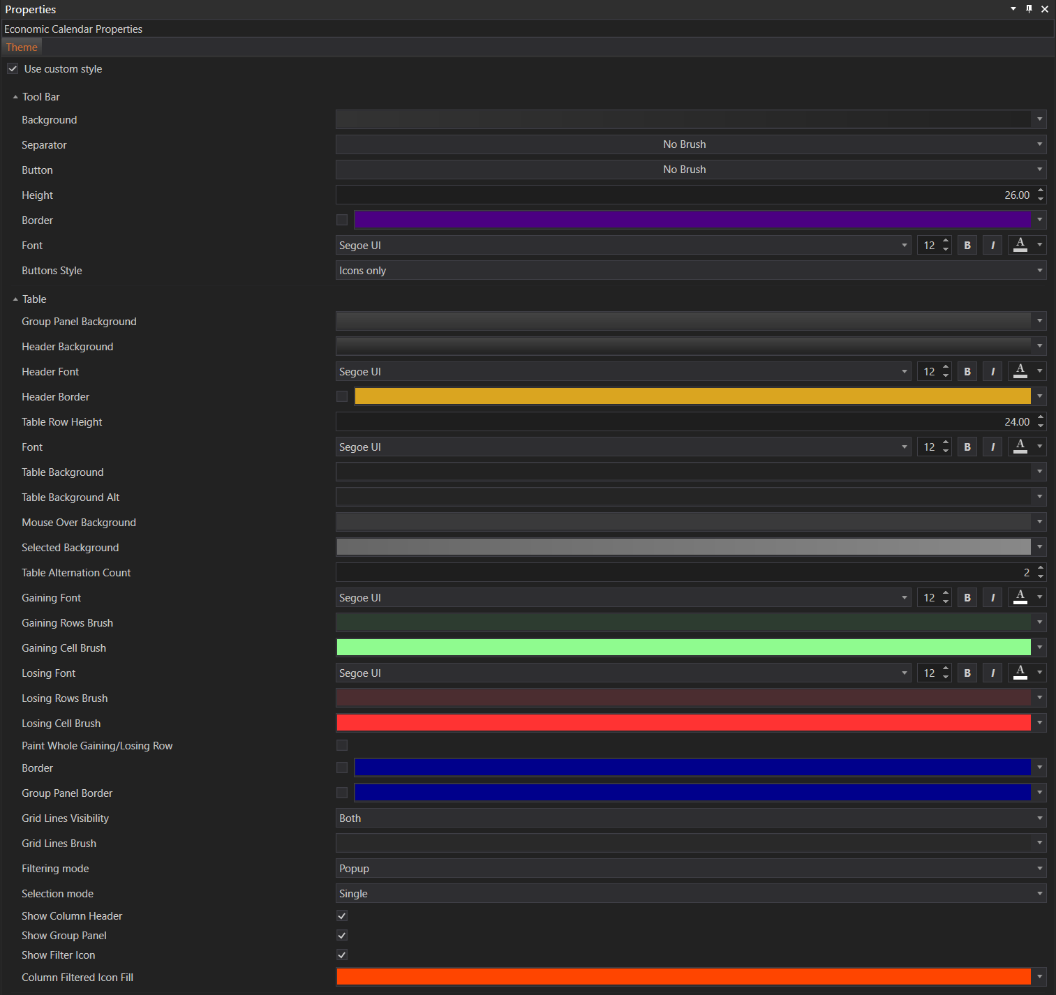 The Theme tab provides options to customize the visual aspects of the toolbar and table within the Economic Calendar module. These customizations help improve the overall user experience by making the interface more intuitive and visually appealing.