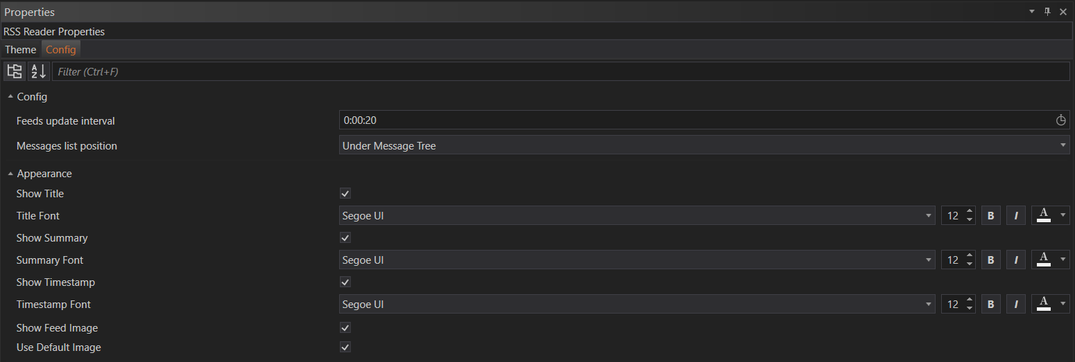 The Properties section for the RSS Reader module in the ASB provides users with the flexibility to tailor the module's appearance and behavior to their preferences. By adjusting settings in the Theme tab, users can ensure the RSS Reader aligns with their aesthetic preferences. The Config tab allows for detailed customization of feed update intervals and the layout of message headers, as well as the appearance of feed items. These customization options enhance the usability and efficiency of the RSS Reader, ensuring that users can stay informed in a way that best suits their needs.