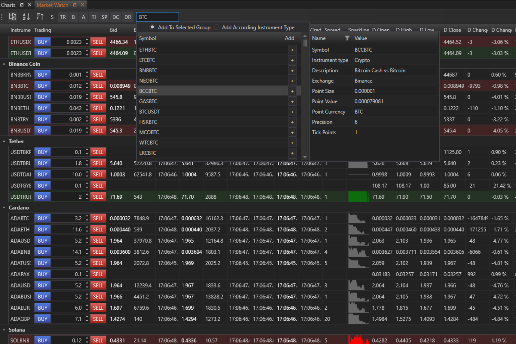 In FinStudio’s Market Watch, the capability to quickly search and add new instruments streamlines the process of expanding and customizing the traders' market watchlist. This feature is particularly valuable for traders who need to adapt rapidly to changing market conditions by monitoring new instruments.