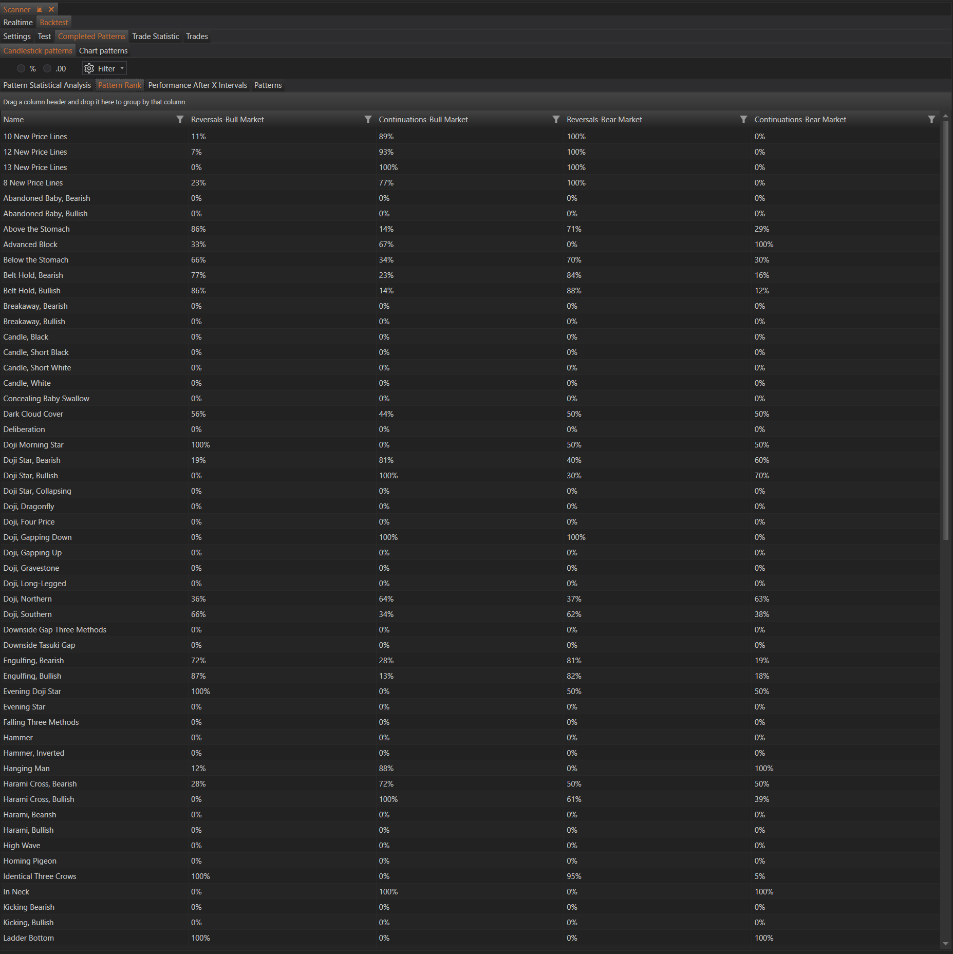 The Pattern Rank section in the Scanner module provides a detailed ranking of candlestick patterns based on their performance in different market conditions. This helps traders understand which patterns are more reliable and effective in bull or bear markets, and whether they tend to indicate reversals or continuations. Below is an explanation of the columns and terms used in this section: