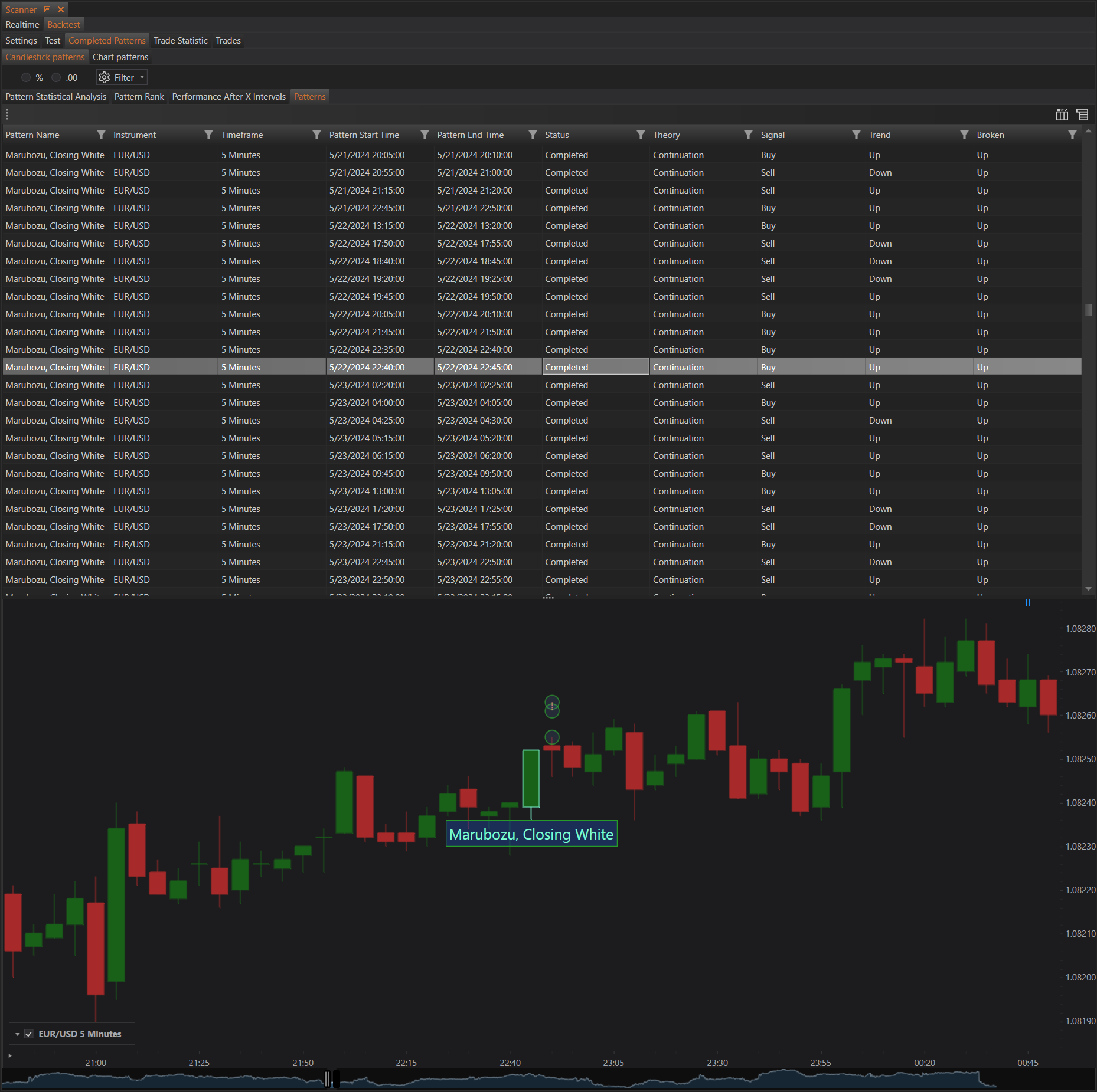 For instance, the table might show multiple occurrences of the "Marubozu, Closing White" pattern in the EUR/USD instrument with a 5-minute timeframe. Each row provides the start and end time of the pattern, its status, theoretical behavior, generated signal, market trend during detection, and whether the pattern was broken.